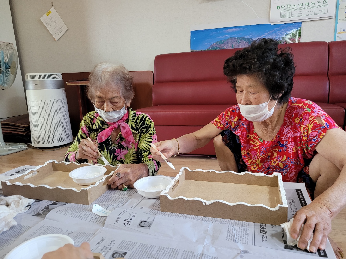 프로그램에 참여하신 안성1경로당 어르신들은 각자 본인만의 디자인으로 넵킨아트 트레이를 제작한 후 완성된 트레이를 과자 쟁반이나 장식품으로 활용하겠다하며 만족감을 표현하셨습니다. 붓으로 칠하고 넵킨을 가장 얇게 떼어내는 등 소근육 및 뇌인지력을 높이는 활동이 제작과정의 대부분이여서 참여 어르신들은 치매예방에 도움이 되는 것 같다고 더 좋다 말씀하셨습니다. 특히,  마을 최고령 김금례(97세) 어르신은 늙은이가 만들었어도 예쁘다며 따로 사진을 찍고 즐거워 하셨습니다.