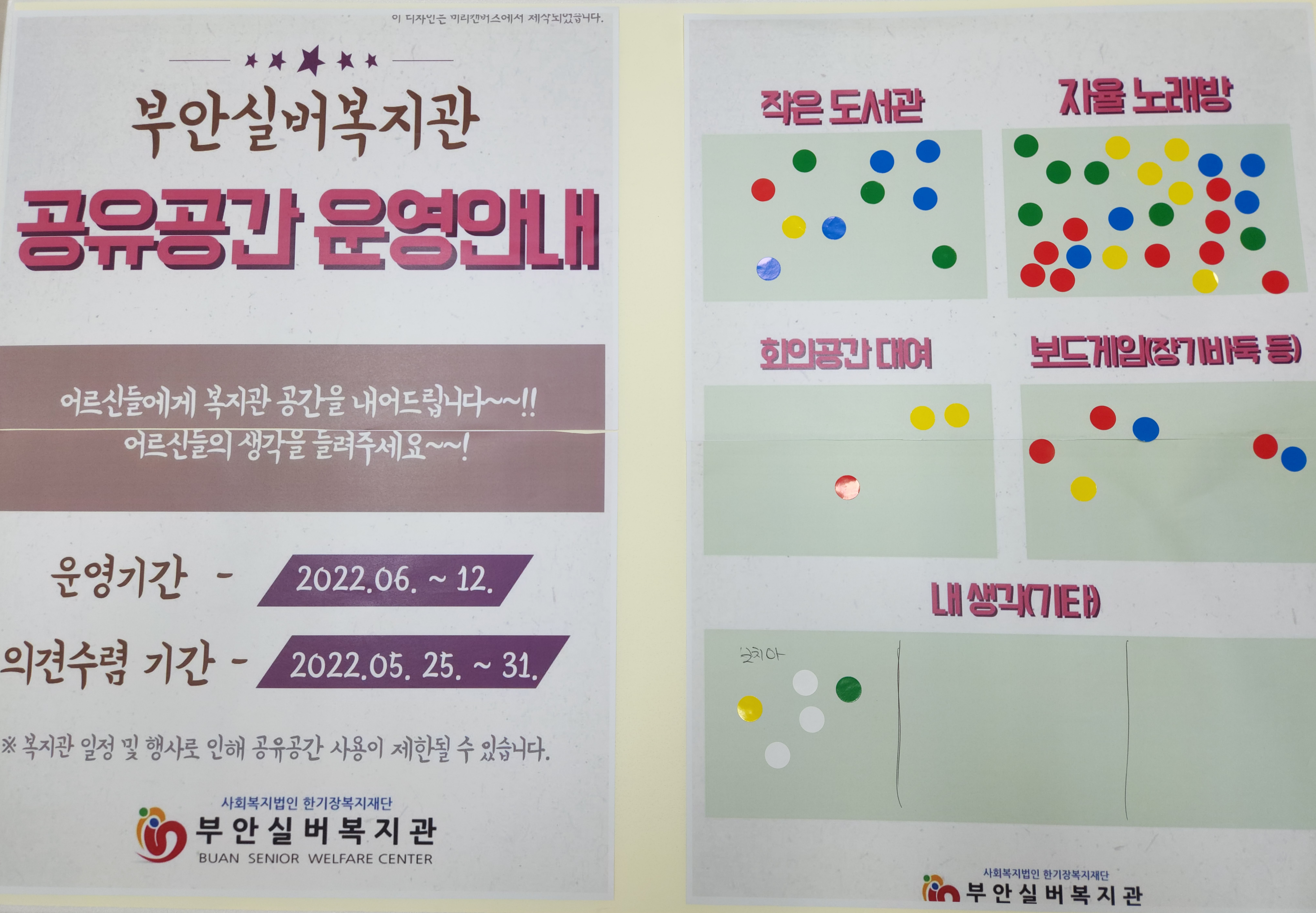 부안실버복지관에서는 어르신과 지역사회가 함께 소통하고 이용할 수 있는 공간을 공유하는 열린복지관을 운영하기 위해 사전 욕구 조사를 2022년 5월 25일부터 31일까지 진행했습니다.