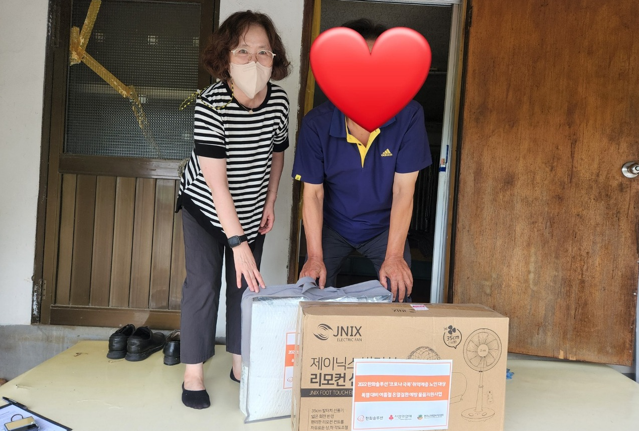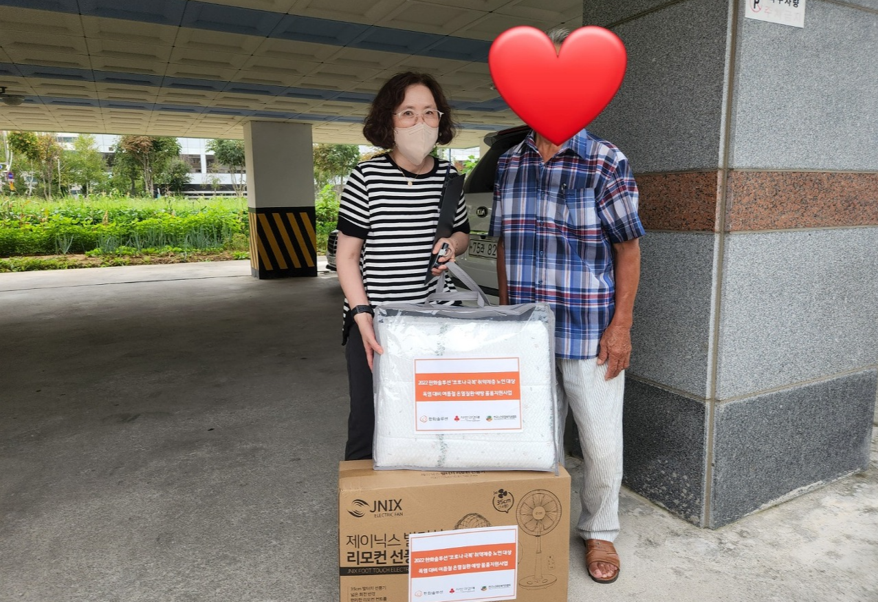 코로나-19 바이러스 지역 재 확산으로 집에서 생활하는 시간이 길어져 오래된 집에서 생활하는 어르신들은 더 힘든 여름을 보내고 있었습니다. 한국노인종합복지관협회에서 "'코로나 극복' 취약계층 노인 불볕더위 대비 여름철 온열질환 예방 물품"으로 제공한 선풍기 1대와 여름 이불 1채씩을 홀몸 세대 어르신들에게 전달하였습니다.