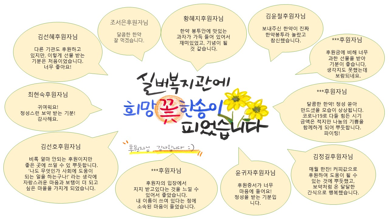 후원자님들의 따듯한 나눔의 손길에 대한 감사한 마음을 작은 정성 담아 보내드린데에 훈훈한 메세지를 보내주셨습니다. 하나하나 모두 소중하고 감동스런 메세지에 큰 힘을 받고 더욱 노력하는 실버복지관이 되도록 노력하겠습니다.