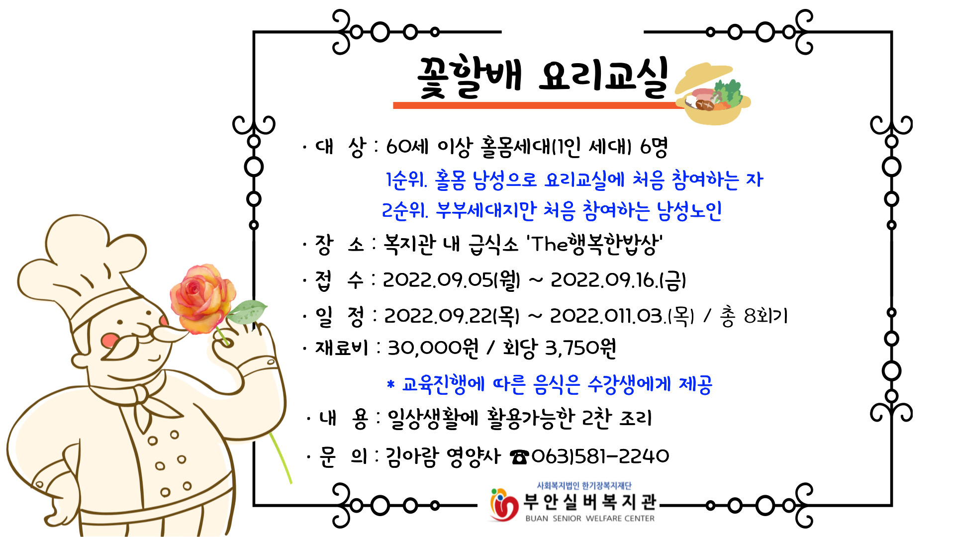 | 부안실버복지관 무료경로식당 대상자 선정 기준 및 2022년 9월 대기자 현황 (0) | 2022.09.06 |