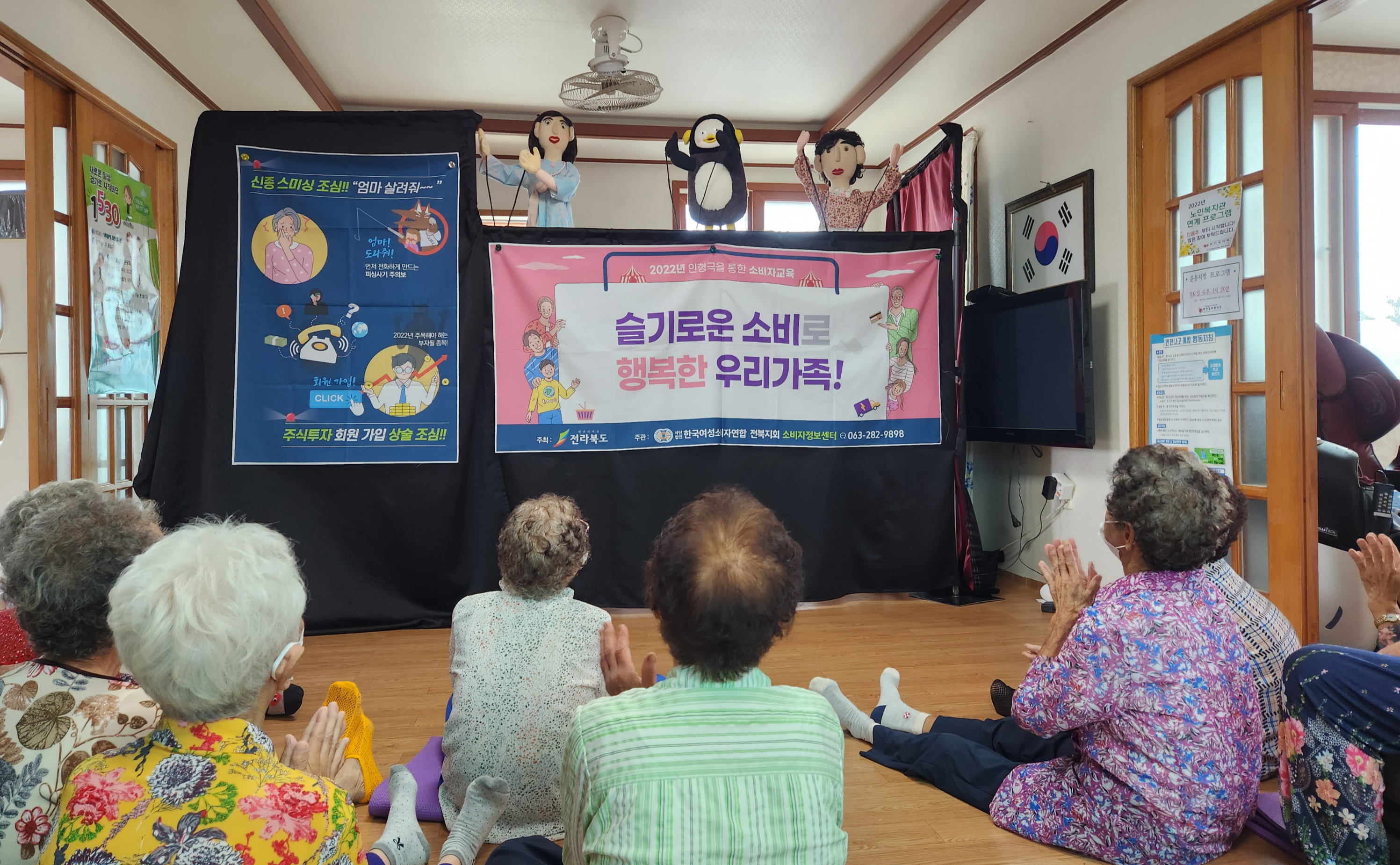 부안실버복지관에서는 복지관 이용 어르신뿐만 아니라 복지관에 찾아오기 힘든 지역 어르신들의 권익증진을 위해 '찾아가는 권익증진 사업'을 진행하고 있습니다. 이번에는 (사) 한국여성소비자연합전북지회 소비자정보센터와 함께 부안읍 역귀경로당, 주산면 인천여성경로당, 상서면 장서경로당을 방문하여 교육을 진행했습니다. 교육은 어르신들이 이해하기 쉽고, 집중력을 높일 수 있는 인형극으로 진행되었습니다.