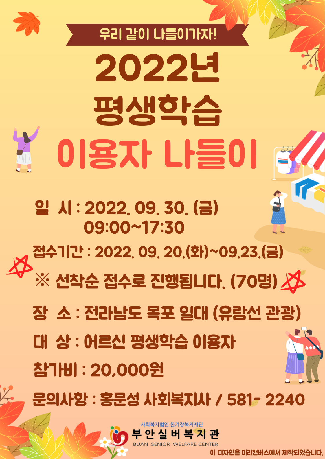 부안실버복지관에서는 2022년 평생학습 이용 어르신을 대상으로 나들이를 진행합니다. 나들이 장소는 '전라남도 목포' 일대이며, 평생학습 반장단 회의를 통해 결정되었습니다. 많은 어르신들의 참여와 관심부탁드립니다.