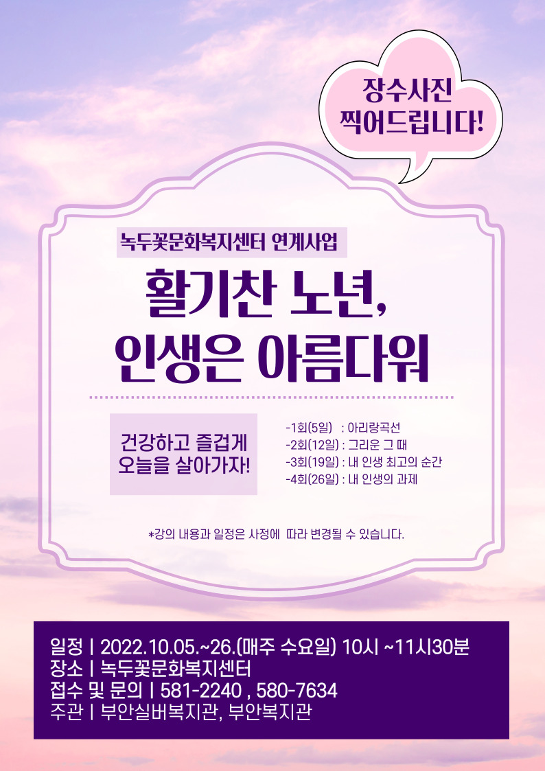 부안실버복지관은 백산면 녹두꽃문화복지센터와 부안복지관과 공동사업으로 '활기찬 노년, 인생은 아름다워! 건강하고 즐겁게 오늘을 살아가자.'라는 주제로 웰다잉 교육을 진행합니다. 이번 교육은 고령화시대를 살아가는 지역 어르신들의 긍정적인 자아성찰과 건강한 노후생활을 위해 이루어지며 부안군 '렌즈에 담은 풍경' 동아리와 함께 장수사진 촬영도 있으니 많은 참여 부탁드립니다.