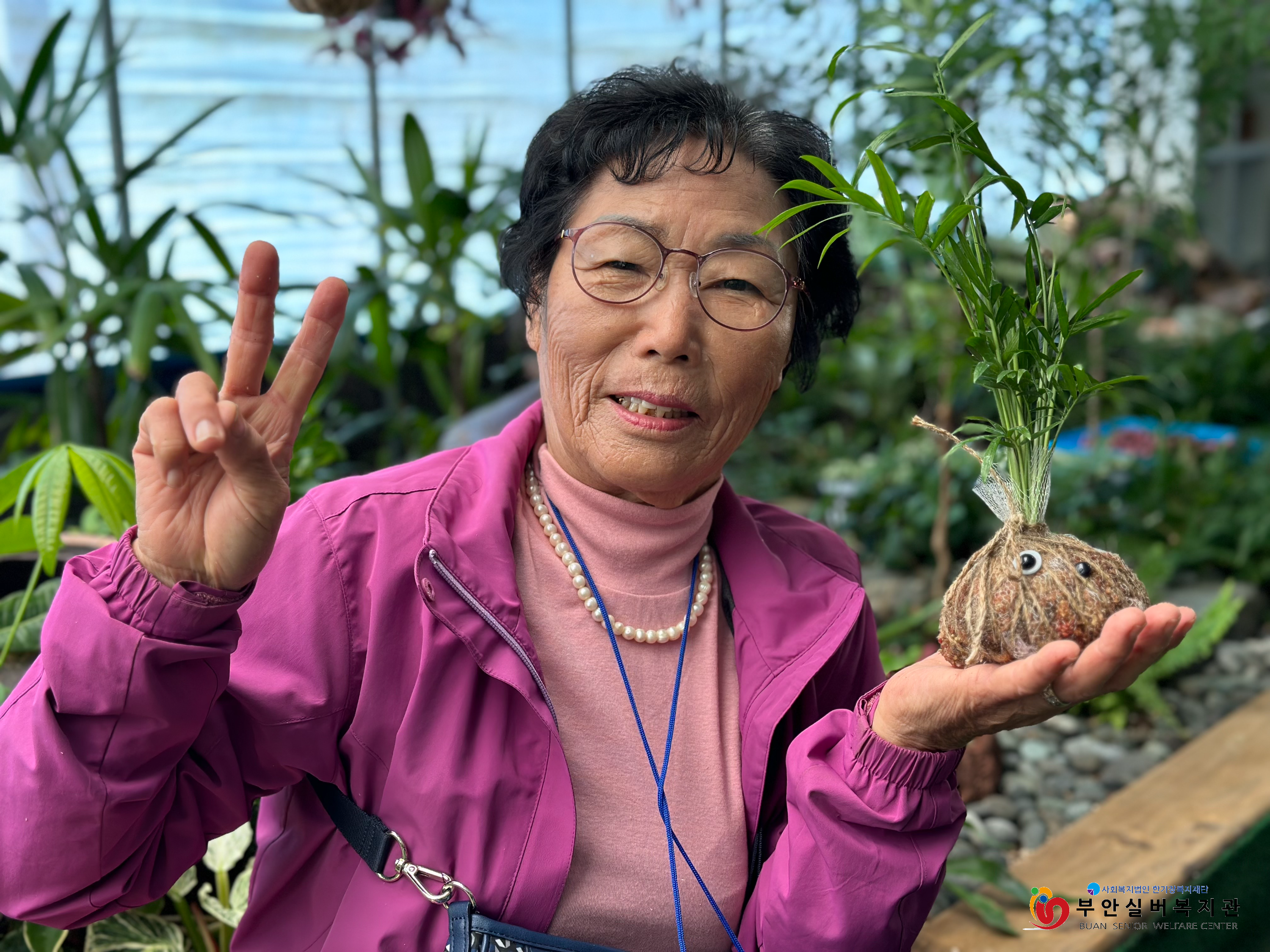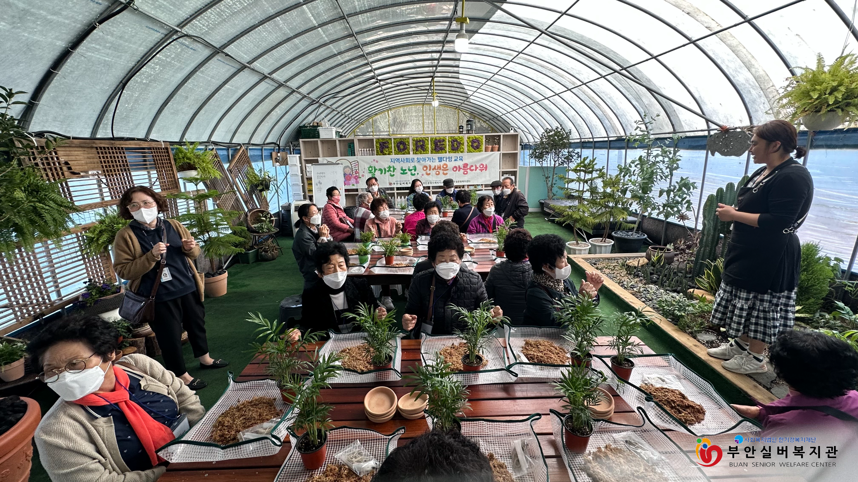 3회기 프로그램은 동진면에 있는 정원카페 '포레도'에서 현장수업으로 진행하였습니다. '코케 다마' 만들기를 원예치료사 선생님과 함께 하며 식물로부터의 치유를 경험하였습니다. 항상 자연과 가깝게 살고 계시는 어르신들이지만 전문가의 손이 닿은 또 다른 푸른 자연에 감동받고 사진으로 인생의 한 페이지를 남겼습니다.