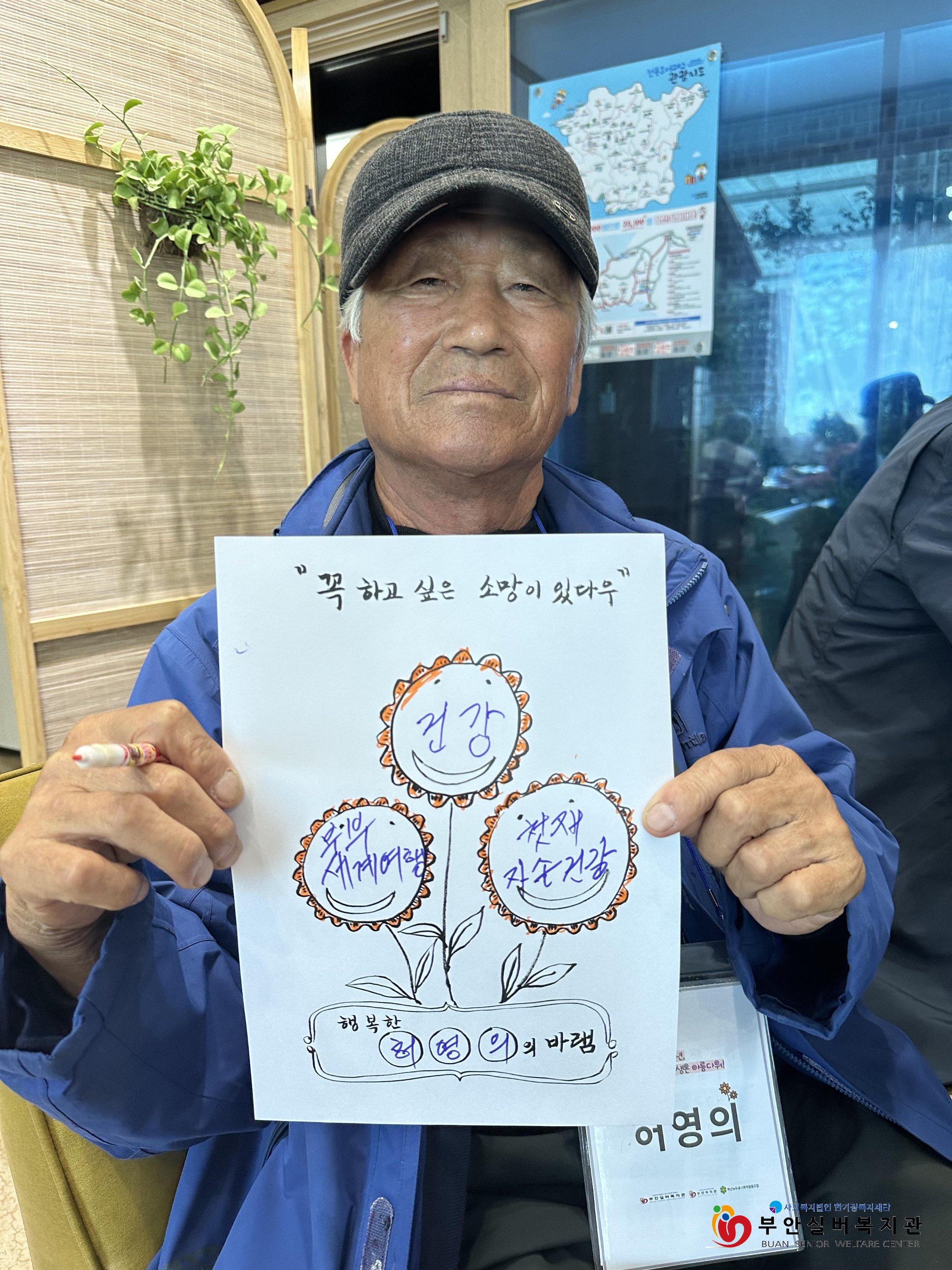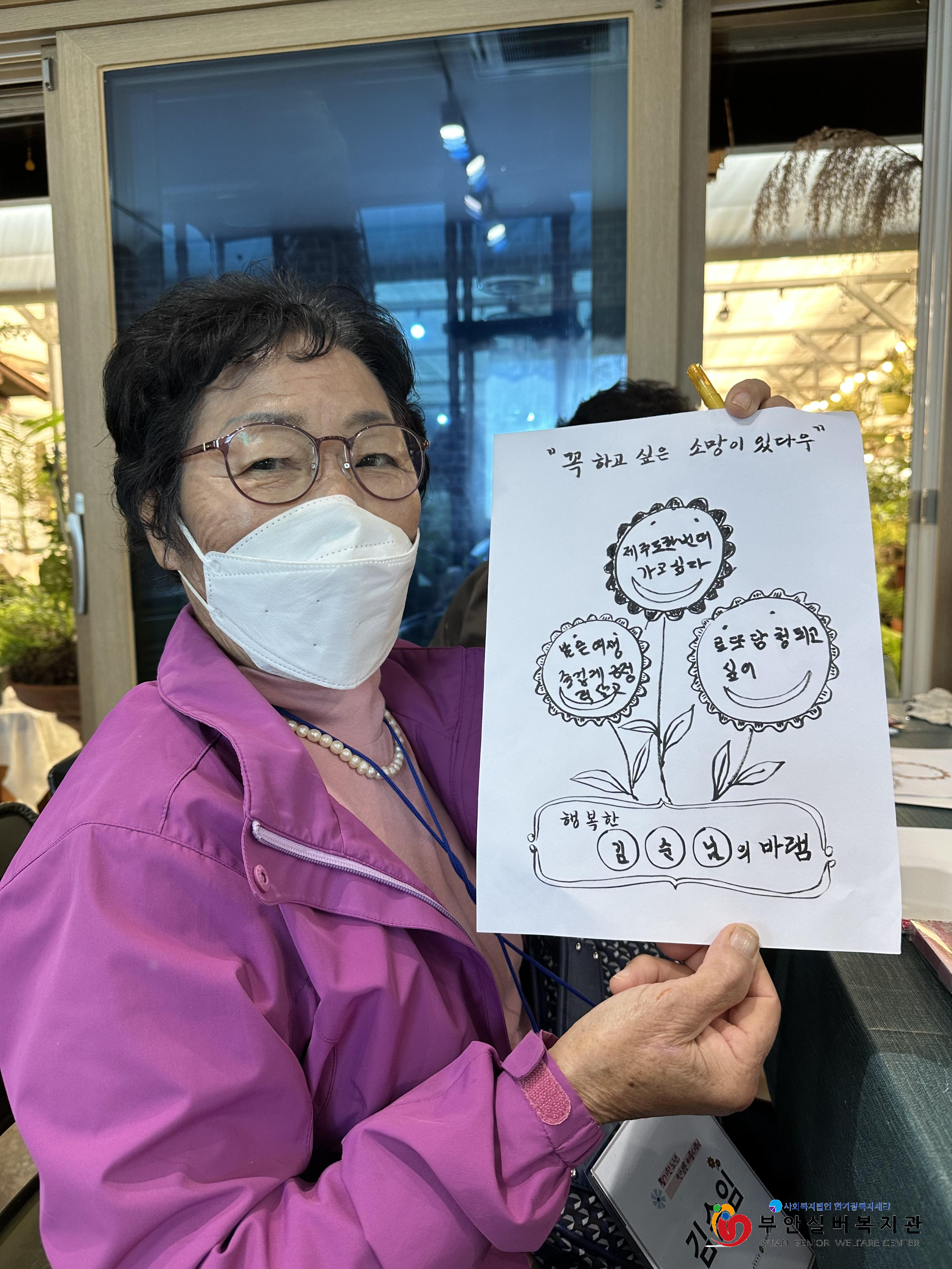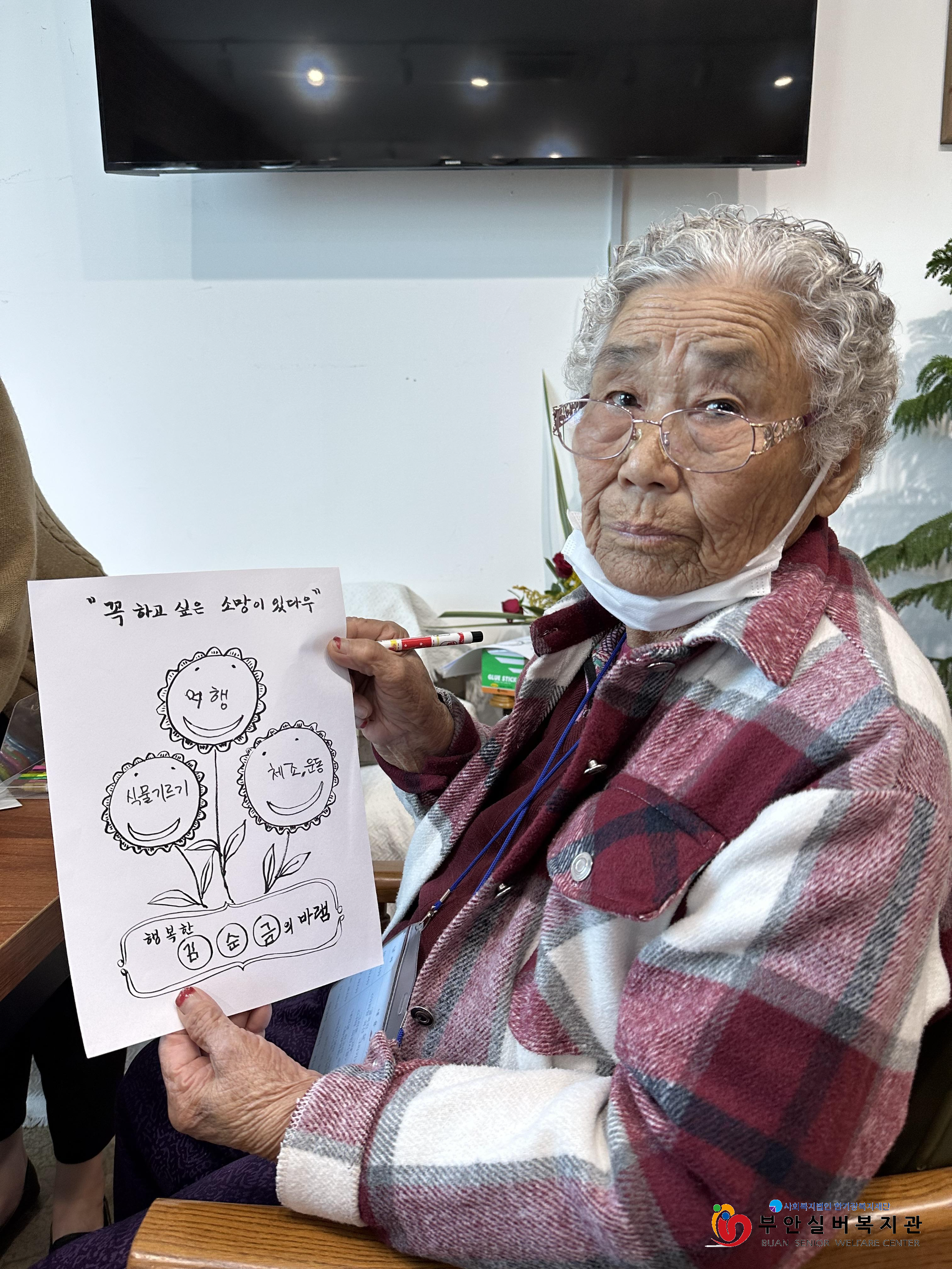 이번 주에는 '어르신들의 버킷리스트(죽기 전에 해보고 싶은 일들을 적은 목록)는 무엇일까요?'라는 주제로 함께 이야기를 나눴습니다. "이제는 해보고 싶은 거, 하고 싶은 게 없다"라며 아들, 딸, 손주들이 잘 되었으면 하는 게 소원이라고 많은 어르신들이 이야기하셨습니다. 어려운 시절 생계를 꾸리며  자녀들 뒷바라지만 하면서 꿈도 잃어버린 듯하여 안타까웠습니다. 큰 꿈은 아니더라도 소소하게 이루고 싶은 희망사항을 찾아보고 그 희망이 이루어지기를 꿈꿔보기로 했습니다.