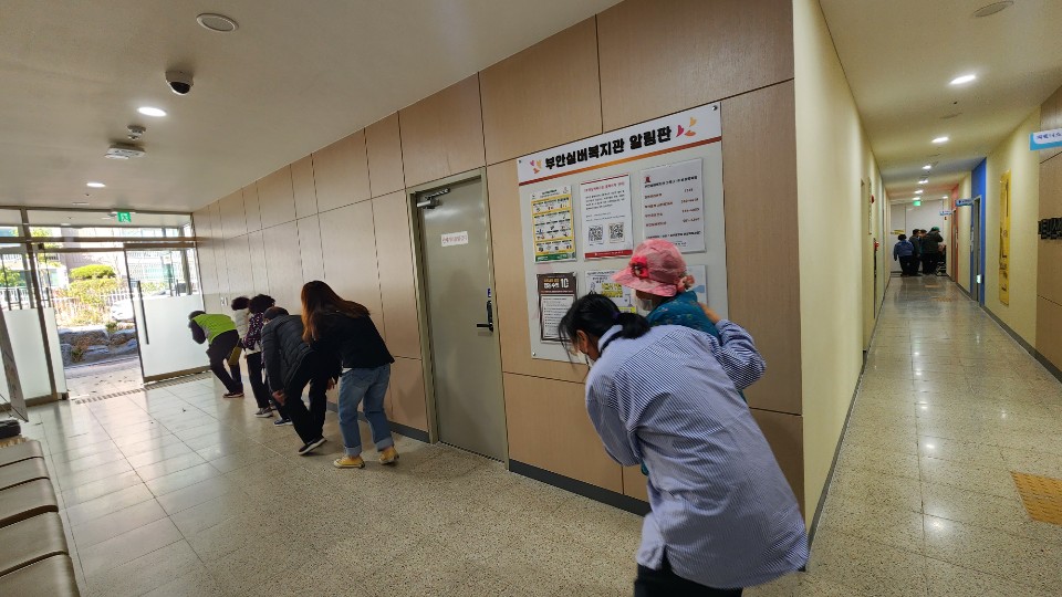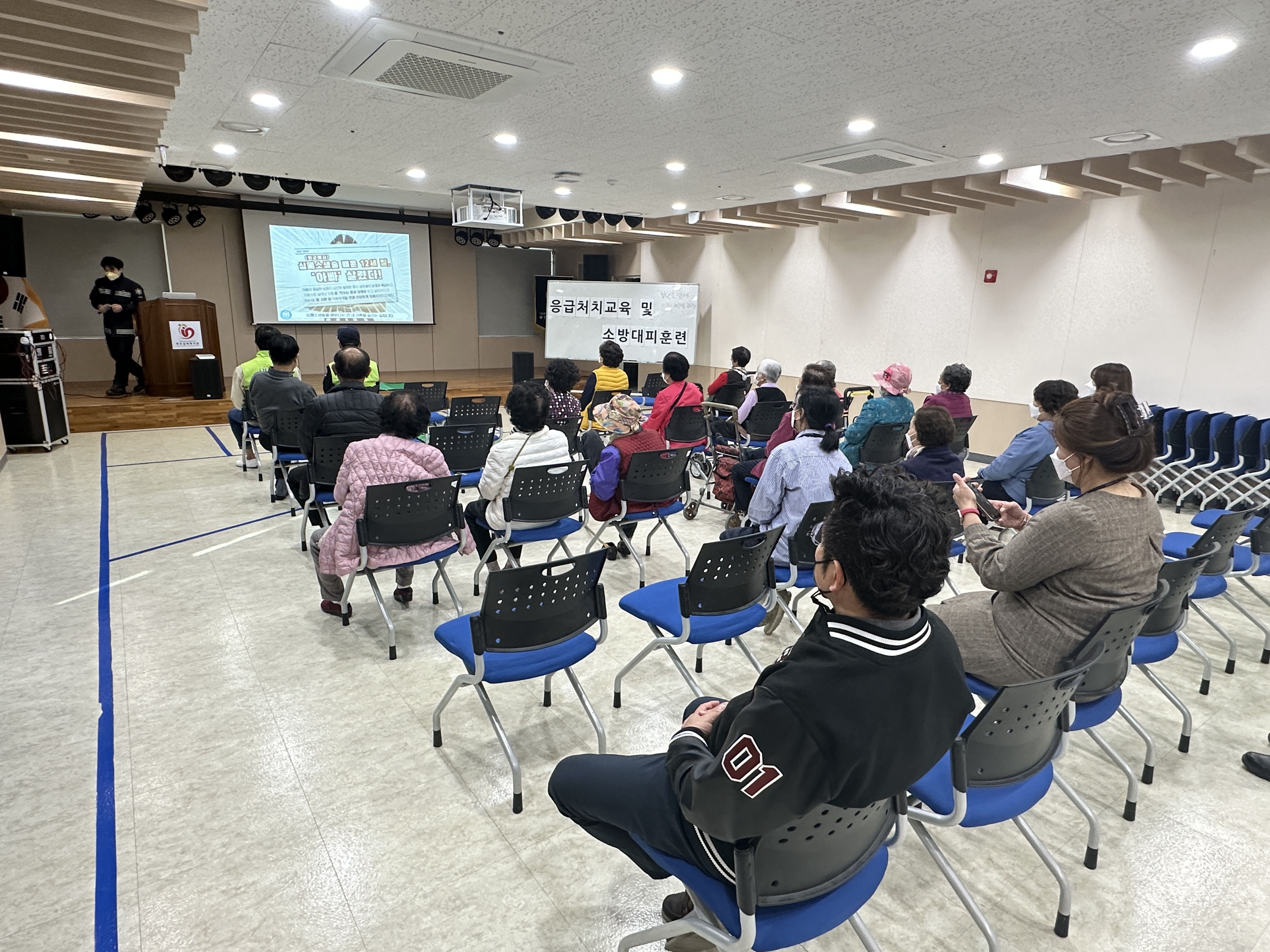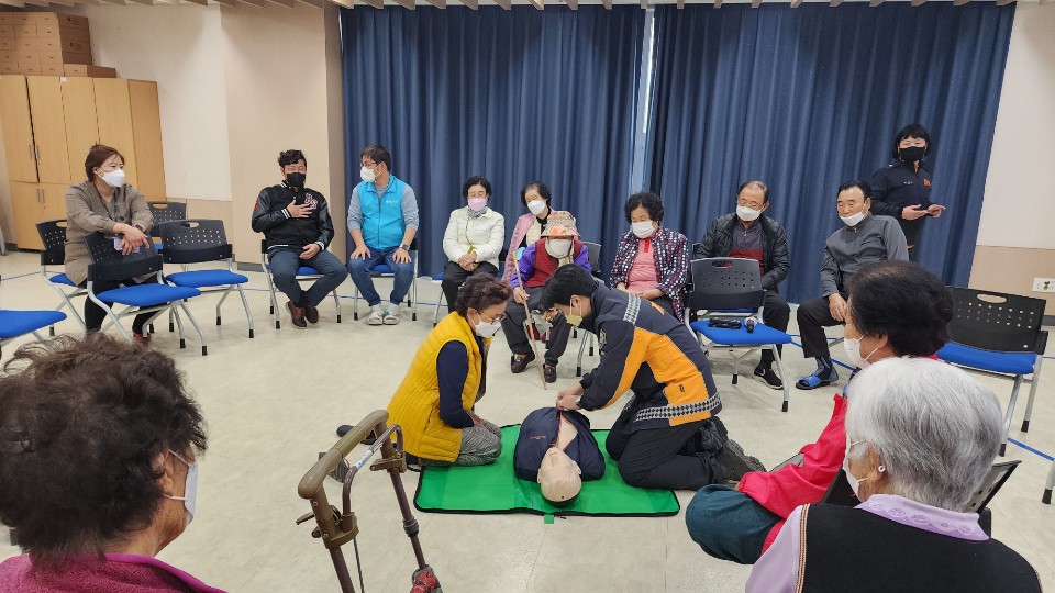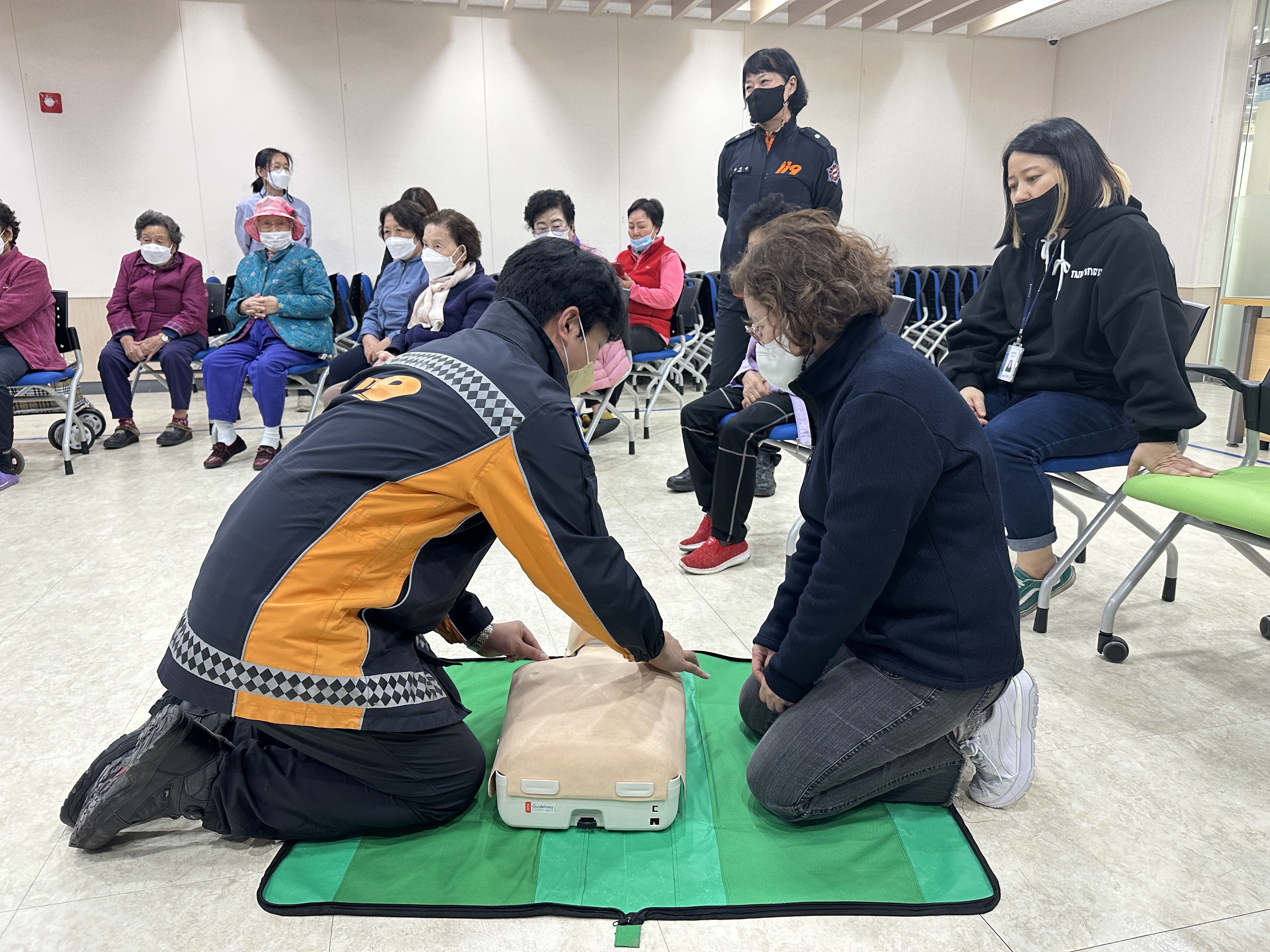 이번 훈련은 1층 복지관 화재 시 대피 훈련 및 심정지 환자 발생 시 응급대처법인 심폐소생술(CPR)을 중점적으로 배웠습니다. 부안소방서 최재연 소방관님으로부터 심폐소생술에 대한 교육과 실습을 진행하였습니다. 심폐소생술이 처음이라 어색해하던 어르신들도 이웃을 살릴 수 있다는 말에 훈련에 적극적으로 동참해주셨습니다.