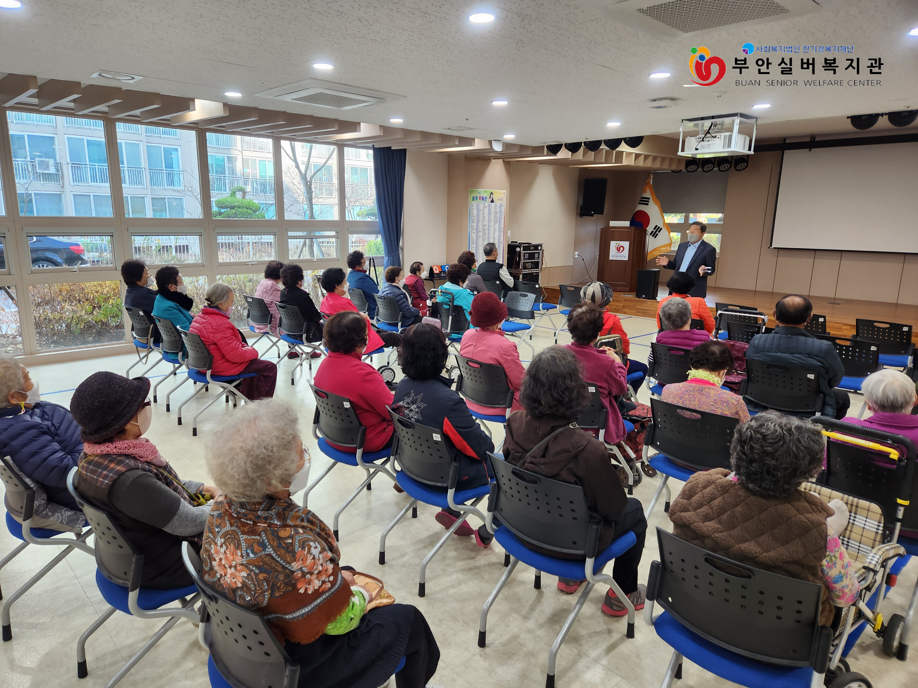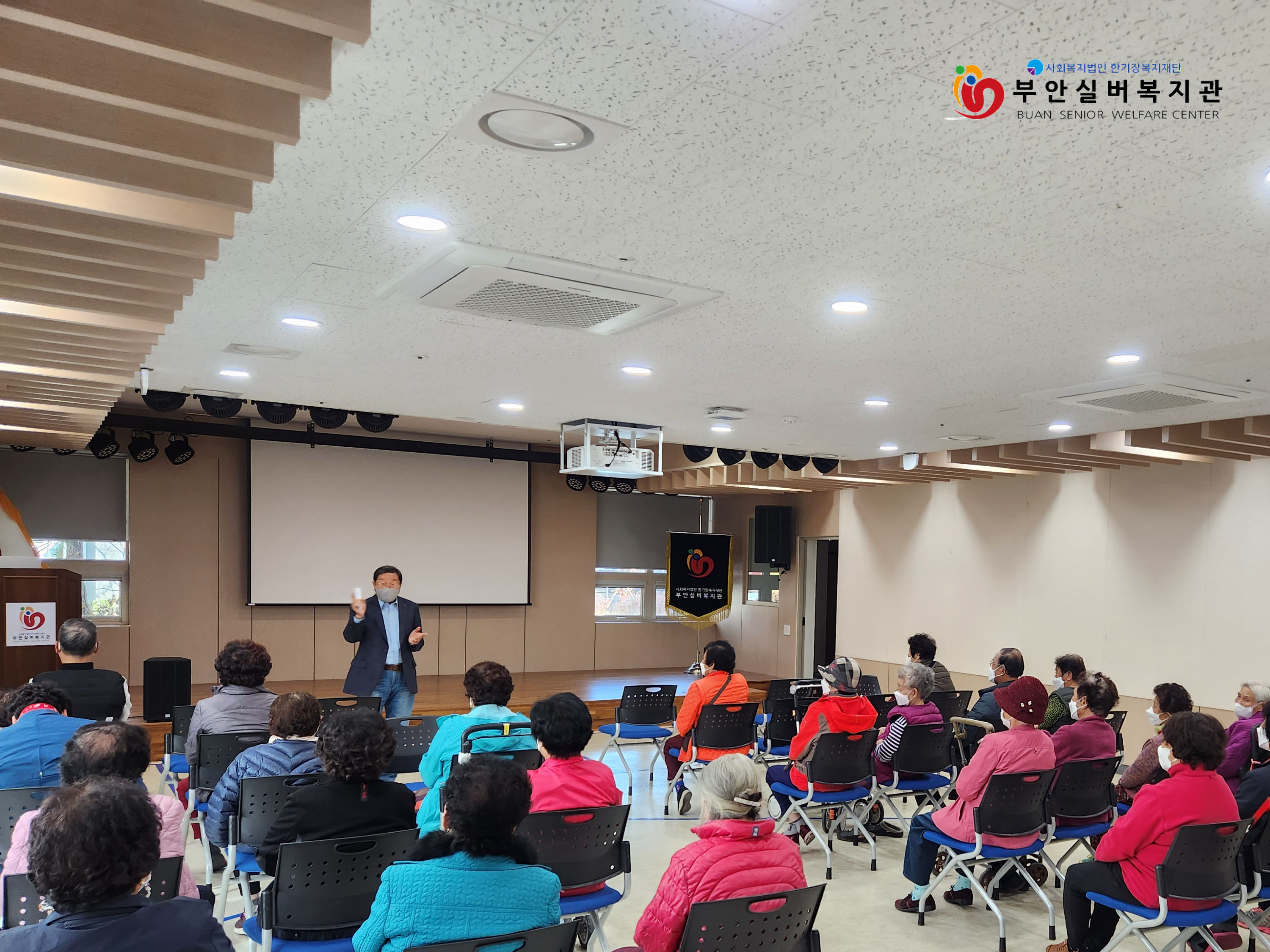 많은 어르신들이 2022년 첫 인문학 강좌의 자리를 채워주셨습니다. 강사님의 판소리 한소절로 강좌를 시작했으며, 어르신들의 인생살이와 앞으로 남은 인생을 긍정적으로 살아가야되는 이유와 방법들을 이야기해주셨습니다. 또한, 여러 사례를 이야기해주시며 어르신들과 공감대를 형성했습니다.