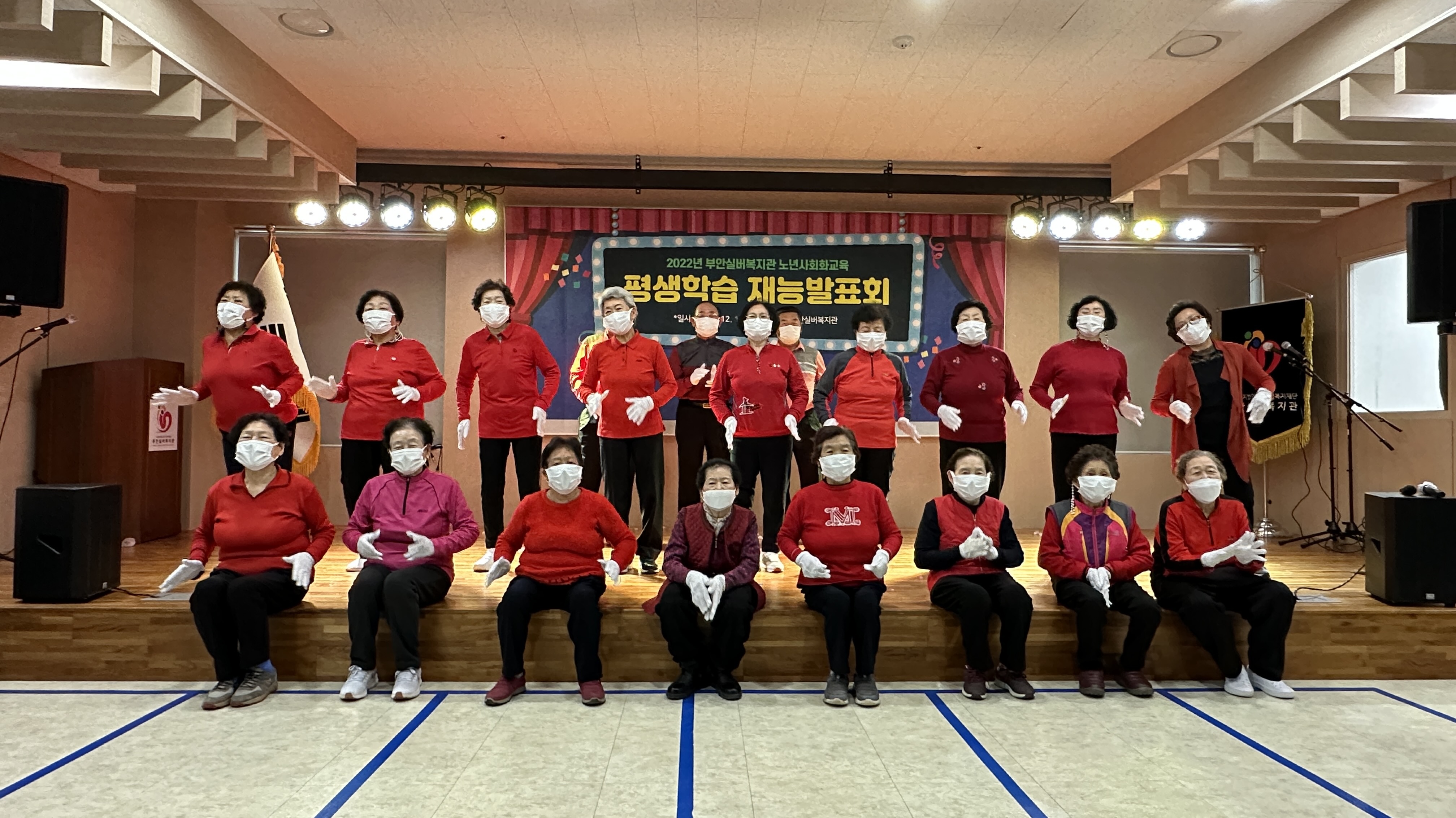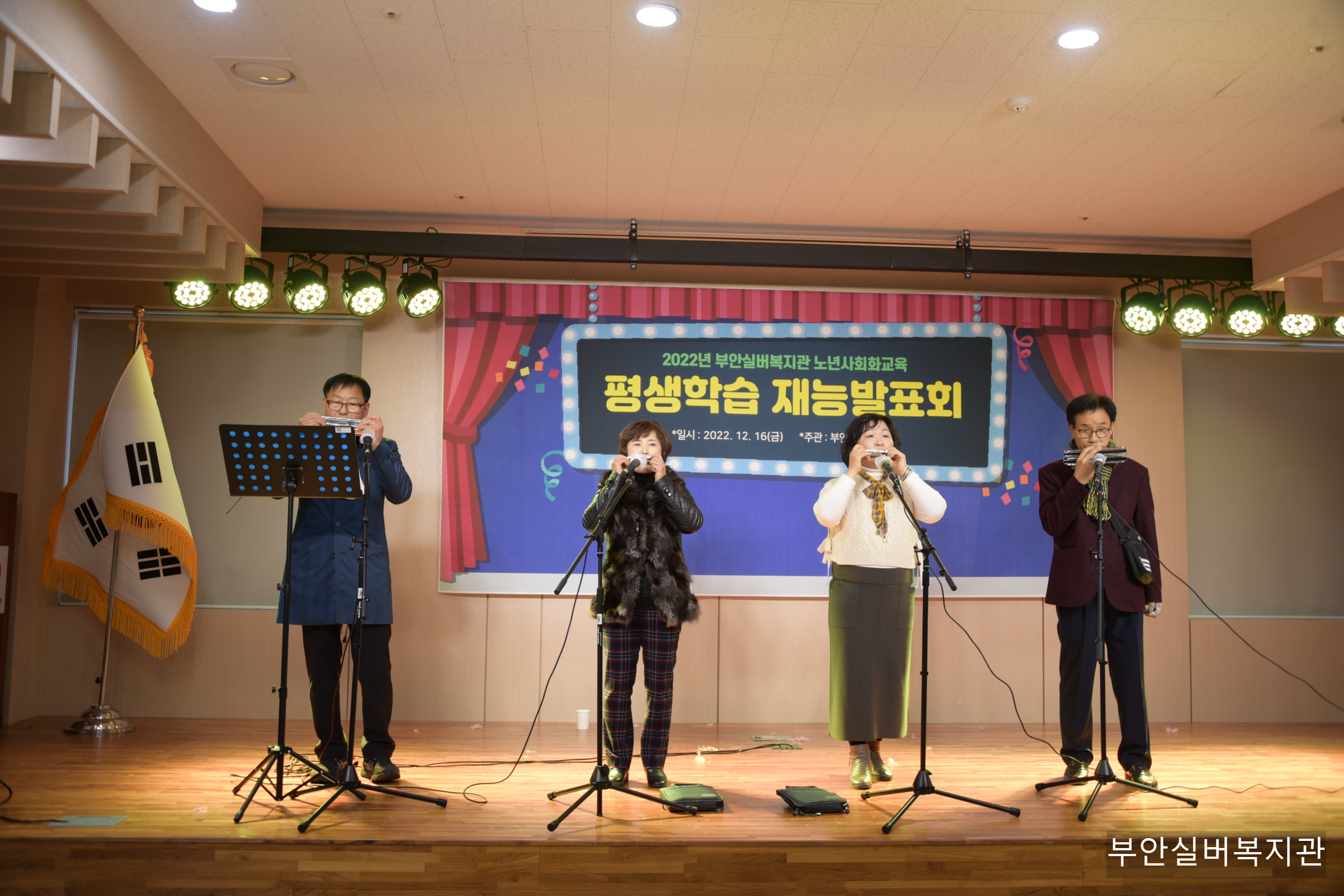 노년사회화교육 평생학습 재능발표회는 정가(시조), 건강체조, 노래, 라인댄스, 생활체조 발표와 부풍율회, 하모니카 축하공연 등이 진행되었으며, 원예, 한글, 사진, 노인 인식개선 활동 등은 1층 로비에 작품으로 전시하였고, 스마트폰반은 영상으로 활동영상을 보여줬습니다. 특별히, 바리스타반은 그동안 배웠던 기량을 뽐내 직접 내린 커피를 어르신들에게 제공하는 등 배움을 나눌 수 있는 소중한 시간이 되었습니다.