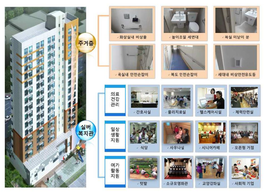 - 개념 : 독거노인 등이 주거지 내에서 편리하게 복지 서비스를 이용할 수 있도록 임대주택에 복지관과 주택을 함께 넣어 짓는 신개념 공공주택이다.