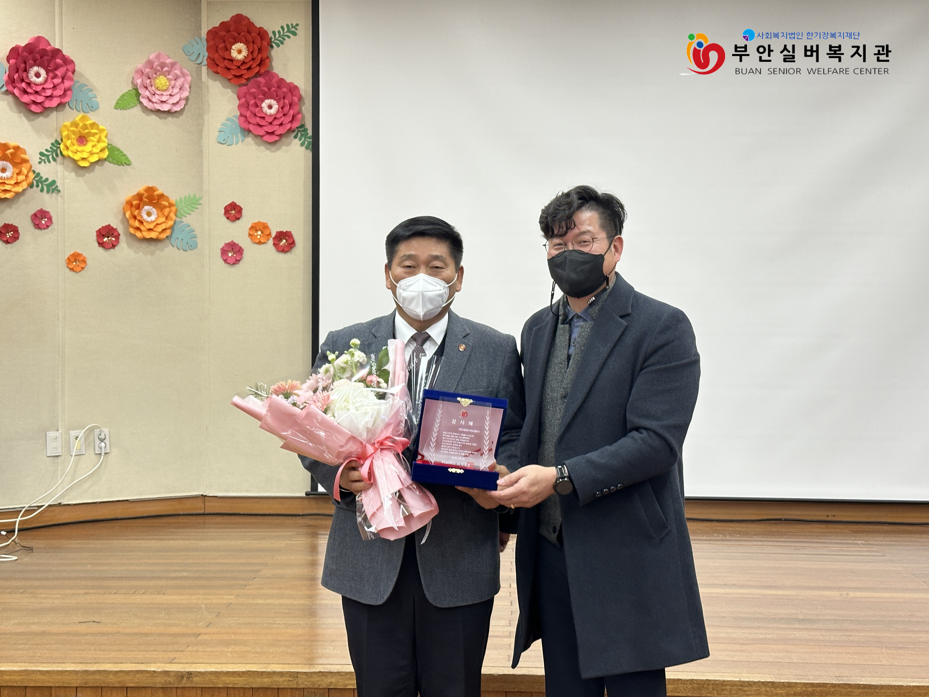 부안실버복지관에서는 개관과 함께 후원으로 협력해주시는 민건강보험공단 부안고창지사에게 감사패를 전달하였으며, 선배시민자원봉사단 구옥녀 어르신, 급식소 자원봉사 진경식·최춘란 어르신, 피트니스실 자원봉사 이계숙 어르신께 감사장을 전달하였습니다.