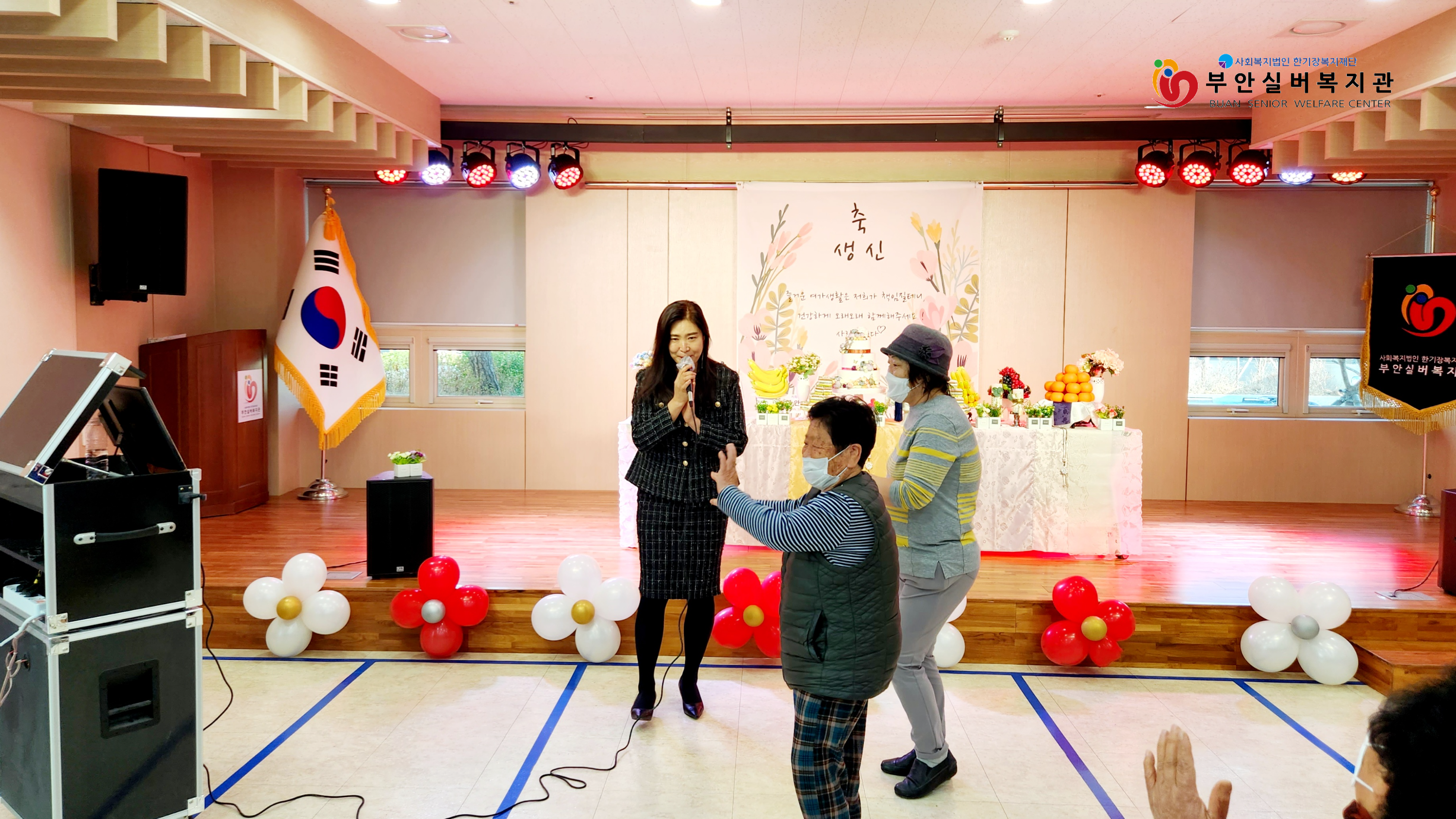 생신잔치 축하공연을 해 주신 이미라 님은 어르신들의 어깨를 들썩이는 흥겨운 노래와 옛 추억을 떠 올리는 노래로 생신잔치 분위기를 북돋워 주셨고, 흥에 넘친 어르신들이 무대로 나가 함께 춤추며, 노래를 부르고 즐거워하셨습니다.