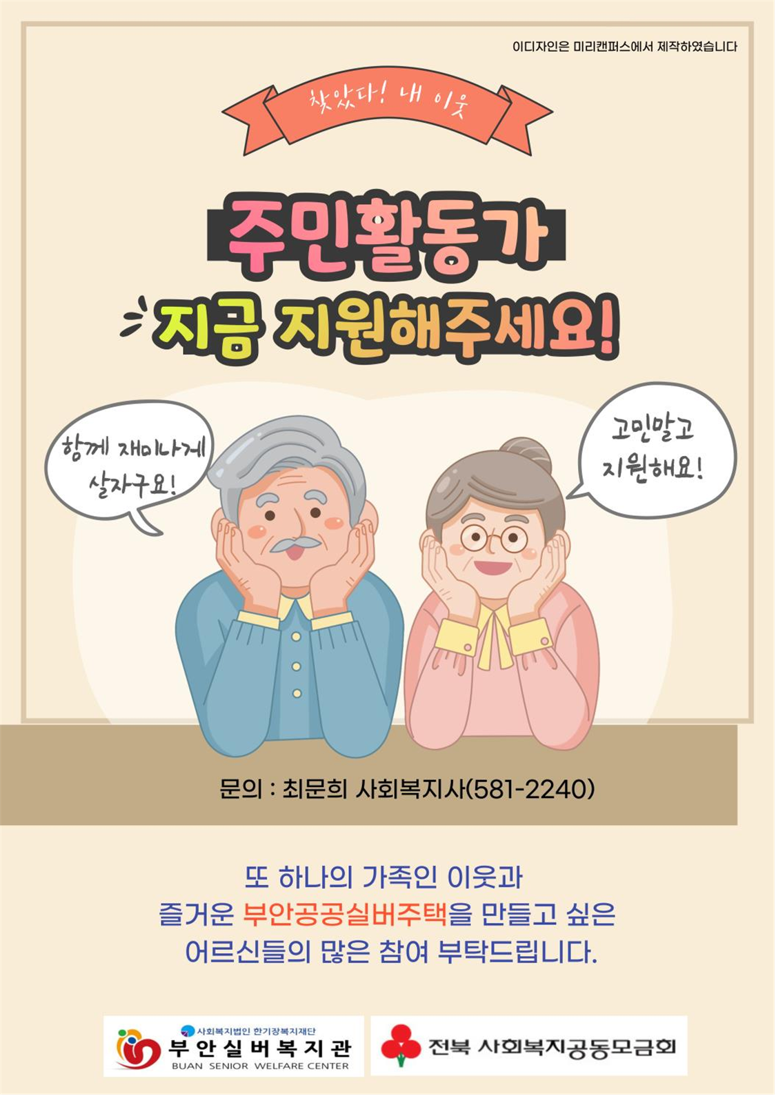 2023년 전북사회공동모금회 신청사업 '이웃관계안전망 만들기, 동고동락 다시 봄' 사업을 함께 이끌어 갈 신규 주민활동가를 모집합니다. 이웃근황살핌활동을 중심으로 고독사를 예방하고 부안공공실버주택의 마을 안전망을 만들기에 주민활동가들의 많은 노력이 있었습니다. '이웃이 이웃을 살피는 살기 좋은 마을공동체'를 위해 더 많은 주민들이 주민활동가가 되었으면 합니다.