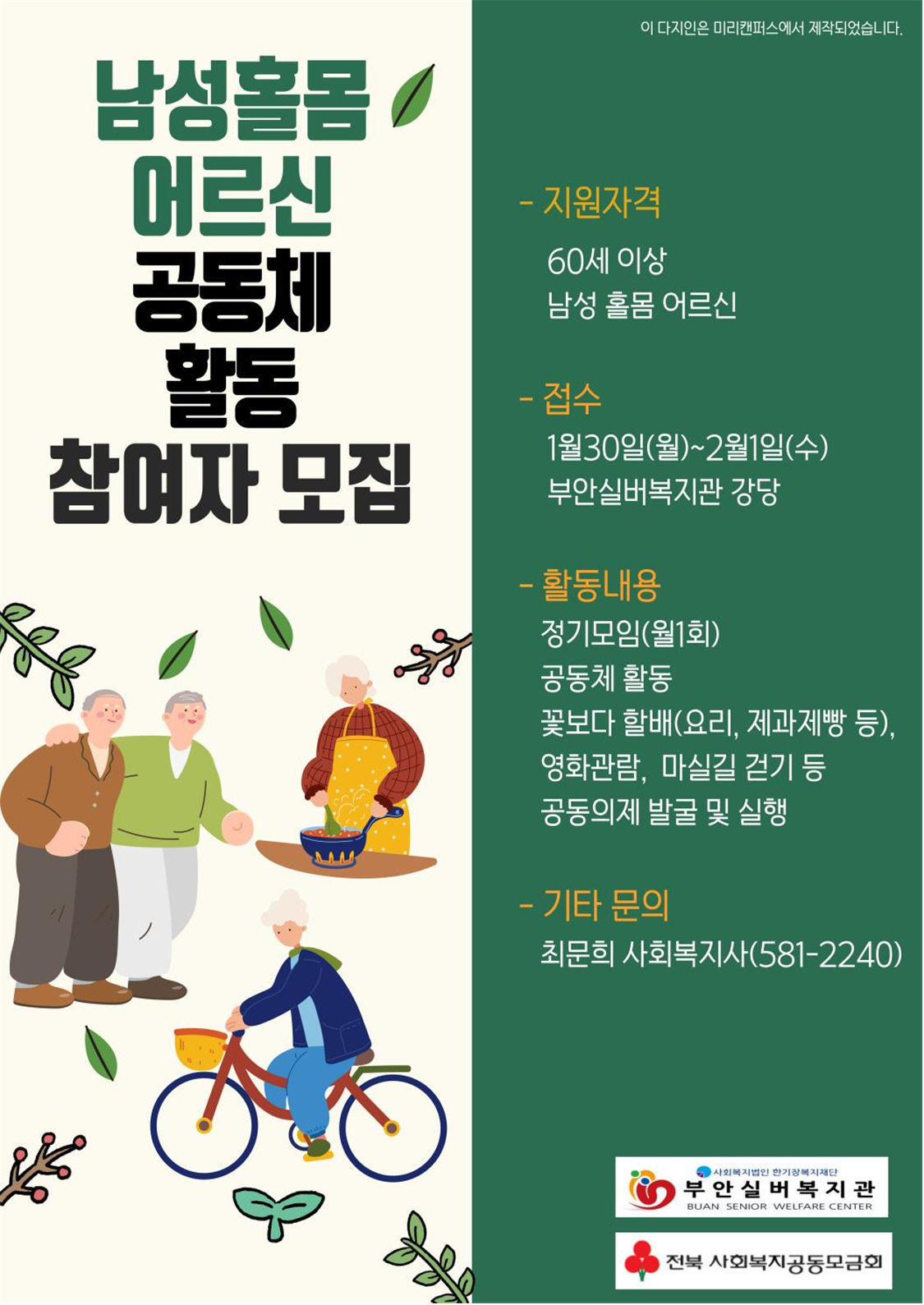 2023년 이웃관계안전망 만들기 '동고동락, 다시 봄' 사업으로 진행되는 남성홀몸어르신 공동체활동은 부안지역사회 공동체의 구성원으로서 당당히 살아가기 위한 남성홀몸어르신들의 사회적 지지체계 형성을 위한 프로그램입니다.
