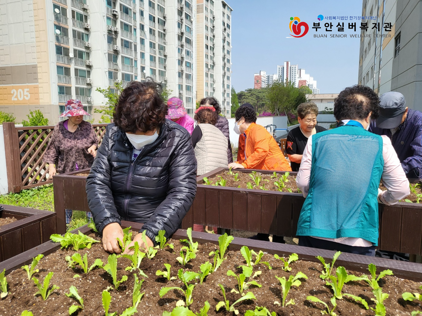 지난 3월 텃밭에 흙도 넣어주고 거름도 넣으며 무엇을 심을까 층별 어르신들끼리 상의하였습니다.  상추, 시금치, 아욱, 가지 등 층마다 다른 작물을 심고 잘 자랄 수 있도록 어르신들끼리 언제 물을 줄지도 이야기 하십니다.