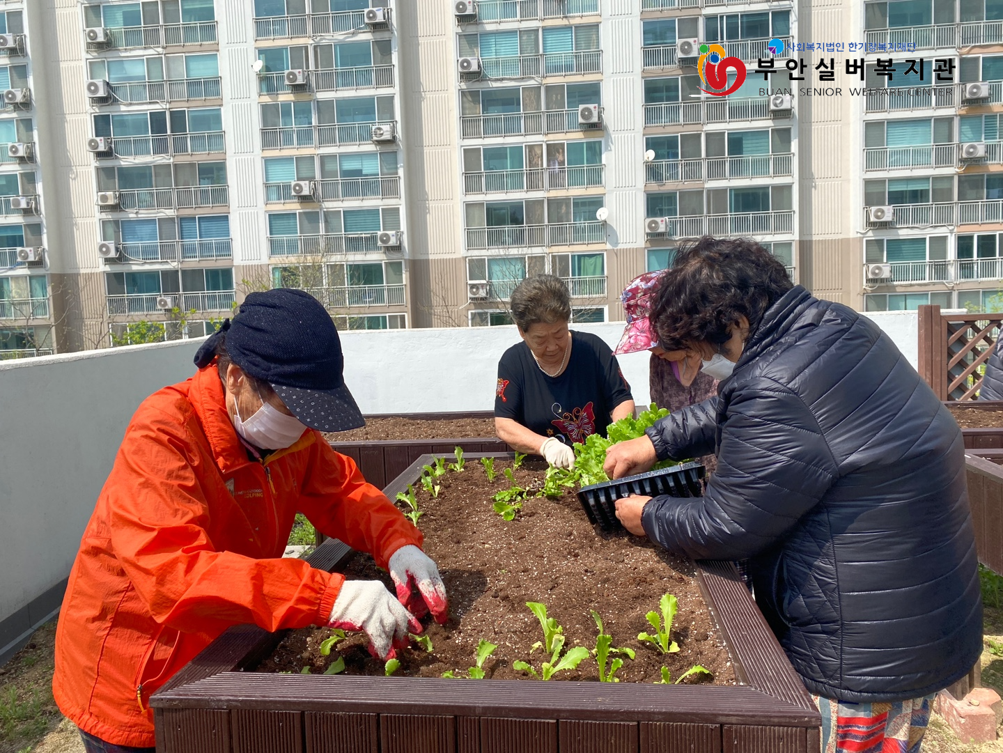 지난 3월 텃밭에 흙도 넣어주고 거름도 넣으며 무엇을 심을까 층별 어르신들끼리 상의하였습니다. 상추, 시금치, 아욱, 가지 등 층마다 다른 작물을 심고 잘 자랄 수 있도록 어르신들끼리 언제 물을 줄지도 이야기 하십니다.