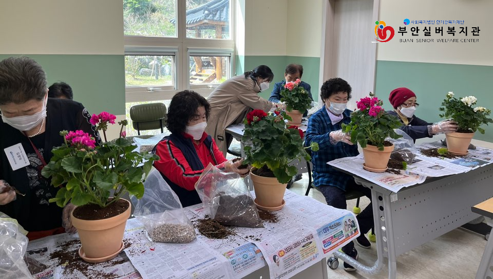부안정신건강복지센터 연계 노인집단상담 프로그램이 4월 28일(금) 6회기로 마무리되었습니다. 8명의 어르신이 참여한 노인집단상담프로그램은 복지관 이용 어르신들의 우울감 해소와 건강한 정신을 위해 원예, 미술, 요리 등 다양한 내용으로 진행되었습니다.