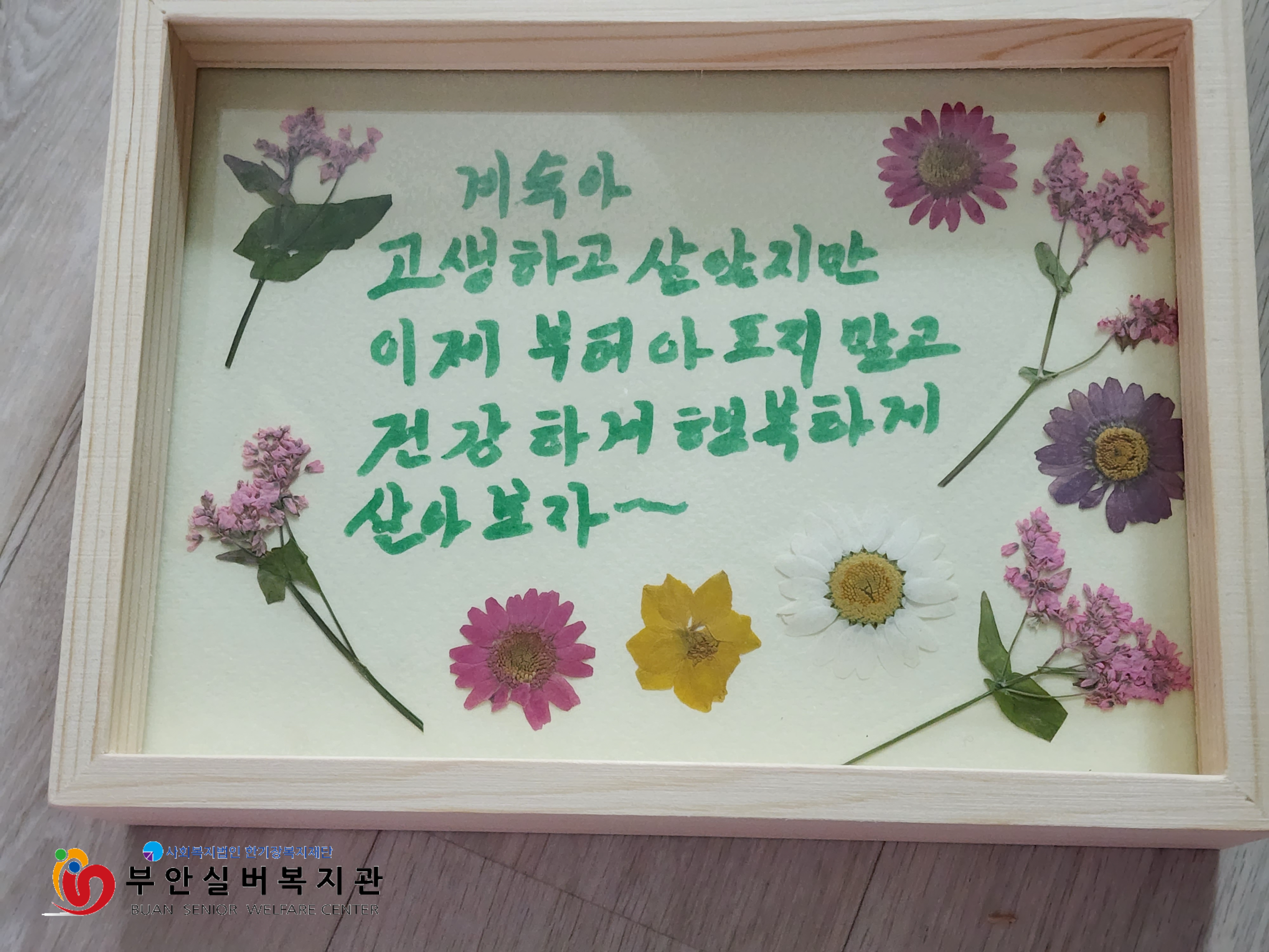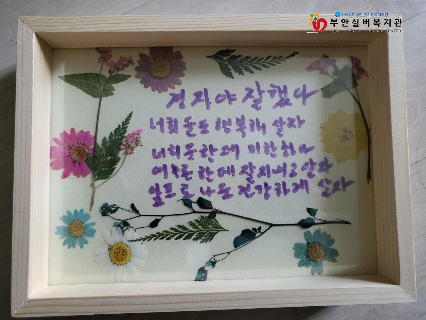 특히 마지막 회기에 제작한 스스로를 응원하는 한마디 액자는 어르신들에게 새로운 경험이 되었고 힘이 되었습니다. 자녀들과 다른 사람에게만 전하던 격려의 한마디를 자신에게 하려니 어색하기도 하고 무엇이라 써야 할지 고민도 하였지만 소박하고 솔직한 글에 보는 사람의 마음도 뭉클해졌습니다.