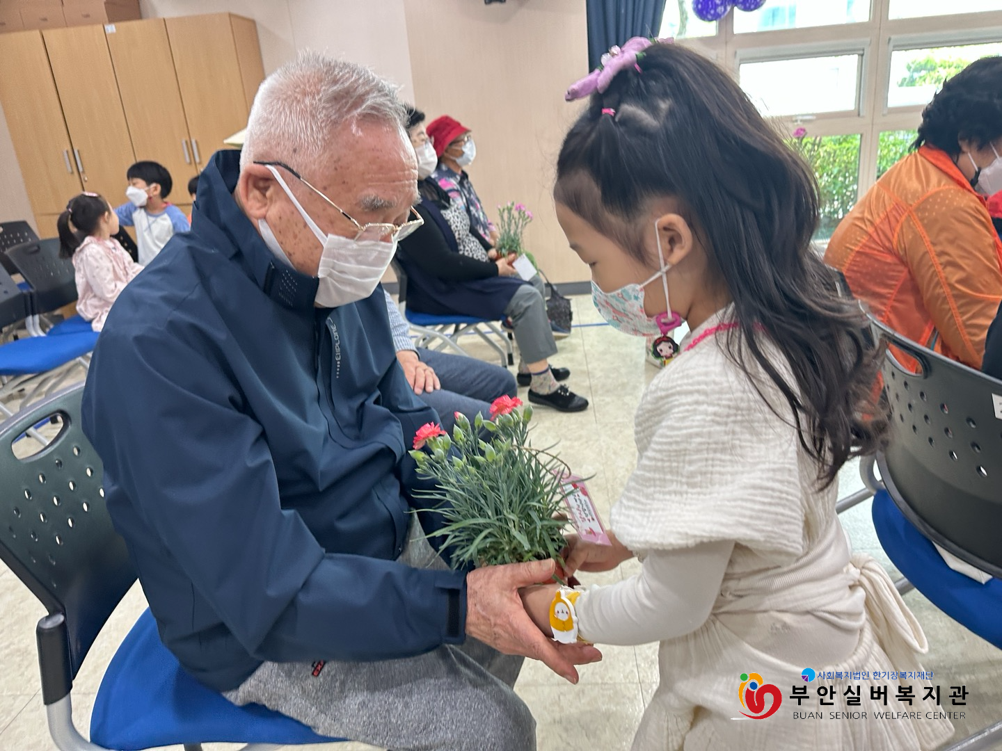 이번 행사에는 매창식물원, 남연침구, 부안건축자재백화점이 카네이션을 후원하였으며, 알파벳어린이집 어린이들의 축하 공연과 카네이션 바구니를 어르신들께 직접 전달하여 더욱 의미 있는 시간이 되었습니다. 기념행사에 참석한 김0례 어르신은 "아이들을 보는 것만으로도 좋은데 노래도 부르고 고사리손으로 화분까지 전달해 주니 잊지 못할 어버이날이 되었다."라고 말씀해 주셨습니다.