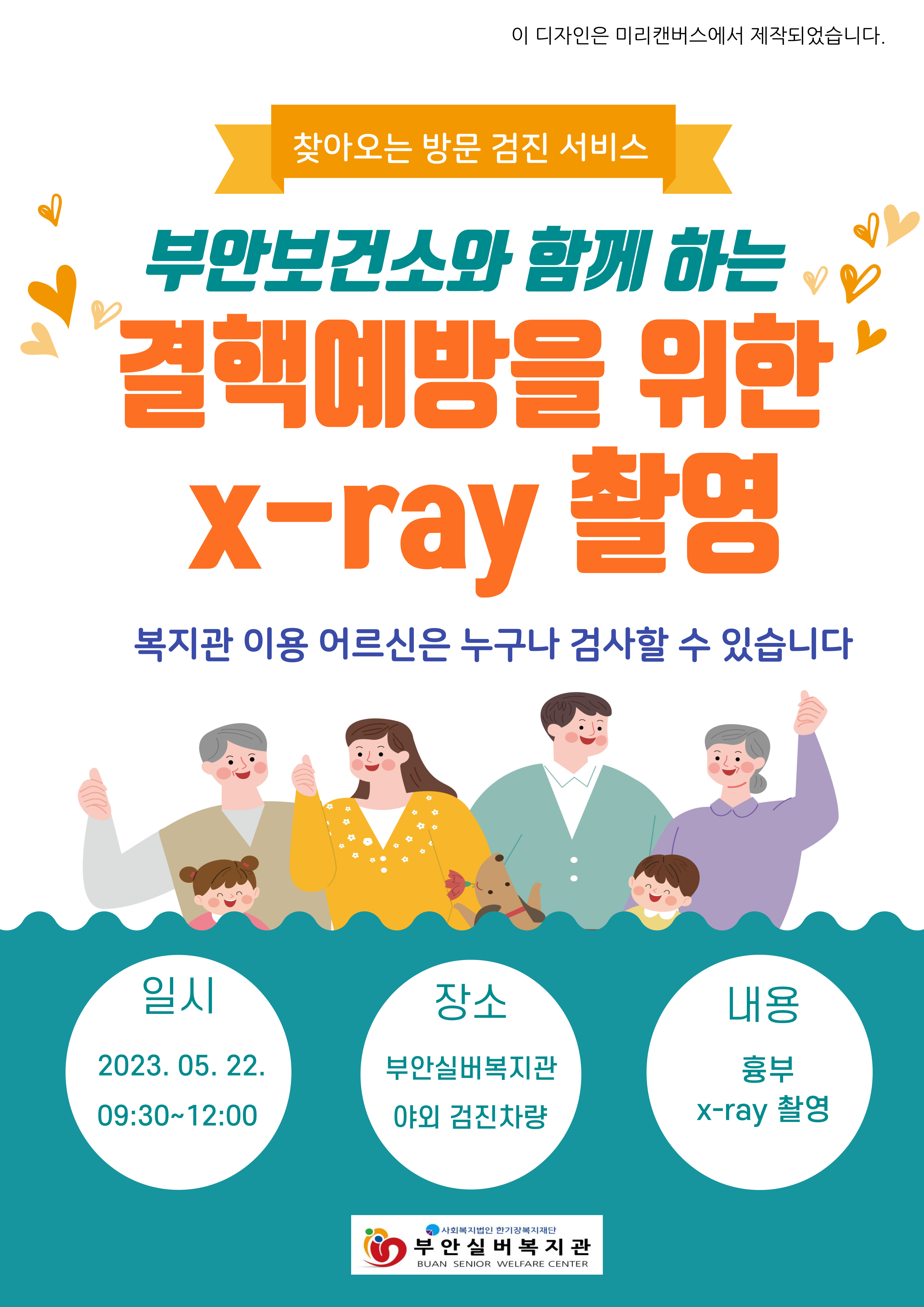 어르신들의 결핵예방과 건강증진을 위해 부안보건소와 함께 흉부 x선 촬영 및 검사를 실시합니다. 복지관 이용 어르신들의 많은 참여를 부탁드립니다.