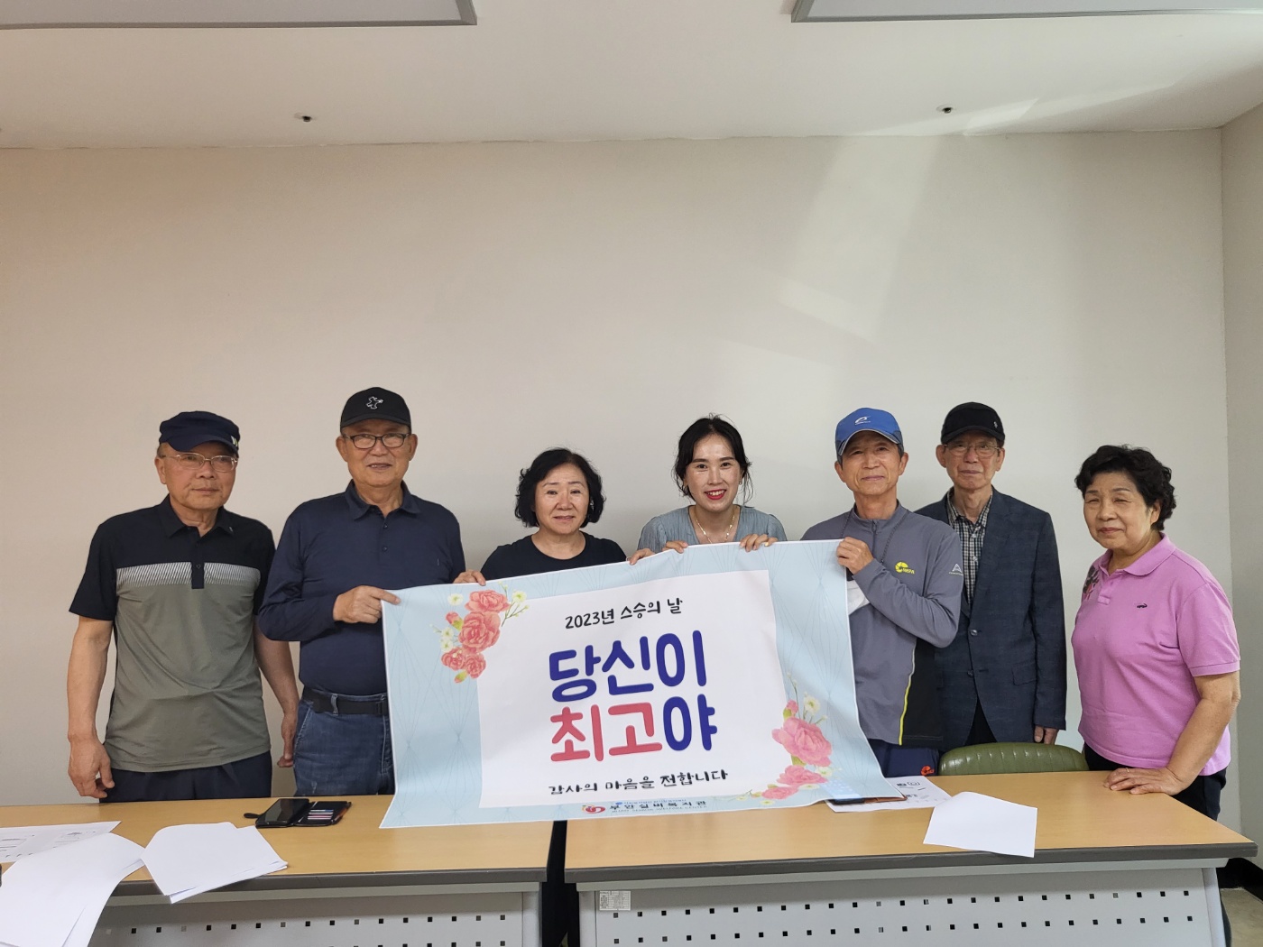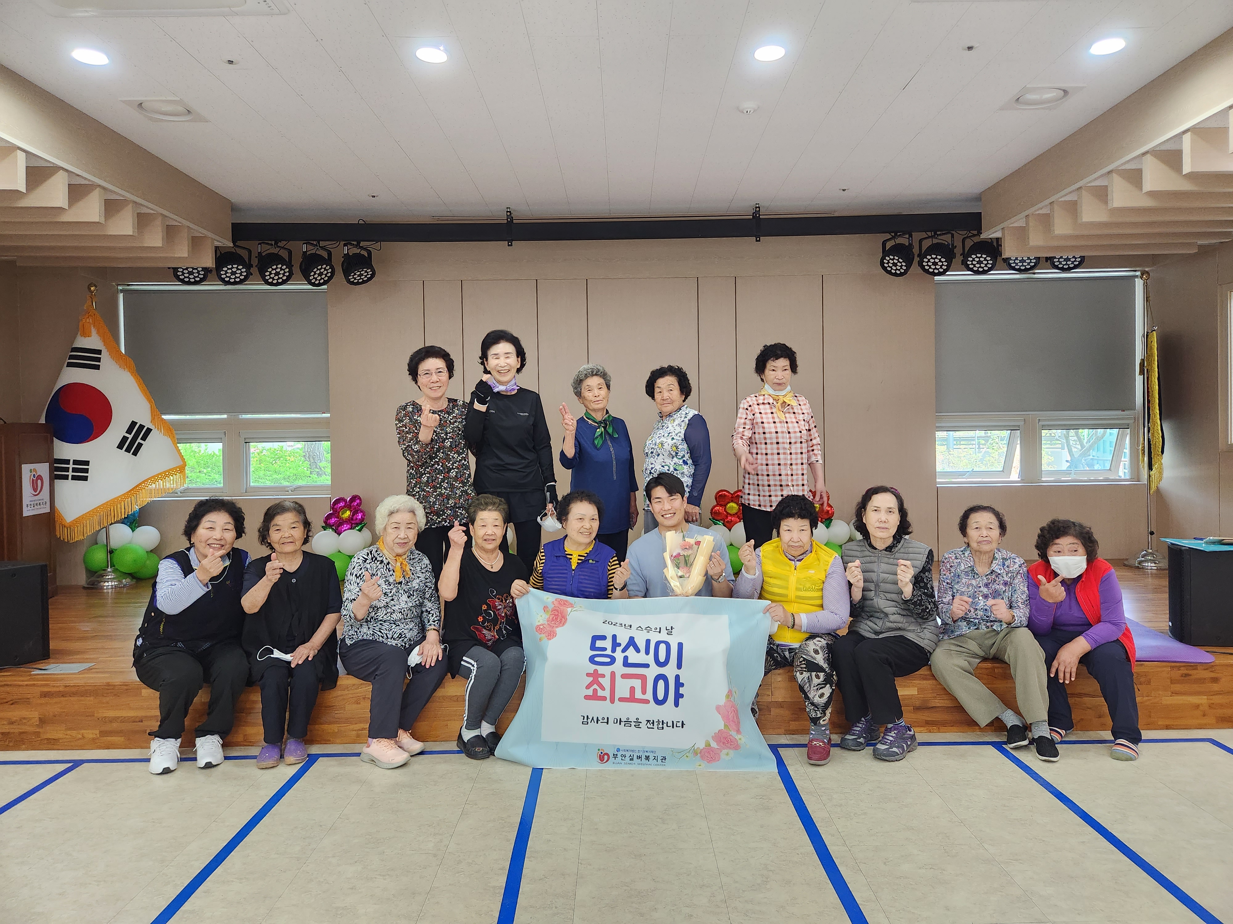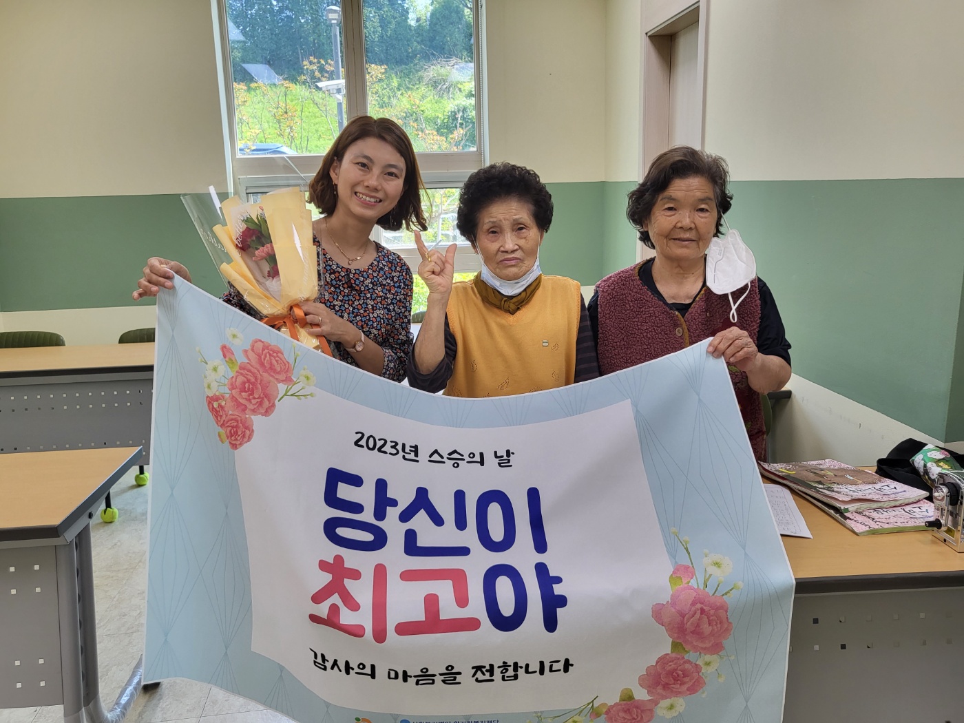 첫 날인 오늘 건강체조, 라인댄스, 사진교실, 매트체조 프로그램 참여 어르신들이 선생님들에게 꽃과 함께 감사의 마음을 전했습니다. 어르신과 강사님 모두 즐거워 하시며, 남은 2023년도 잘 지도 부탁한다고 이야기했습니다.  스승의 날 행사 '당신이 최고야'는 19일(금)까지 스승의날 주간으로 계속 진행될 예정입니다. 오늘 찾아뵙지 못한 프로그램은 스승의 날 주간에 찾아뵙고, 감사인사 전달하도록 하겠습니다.