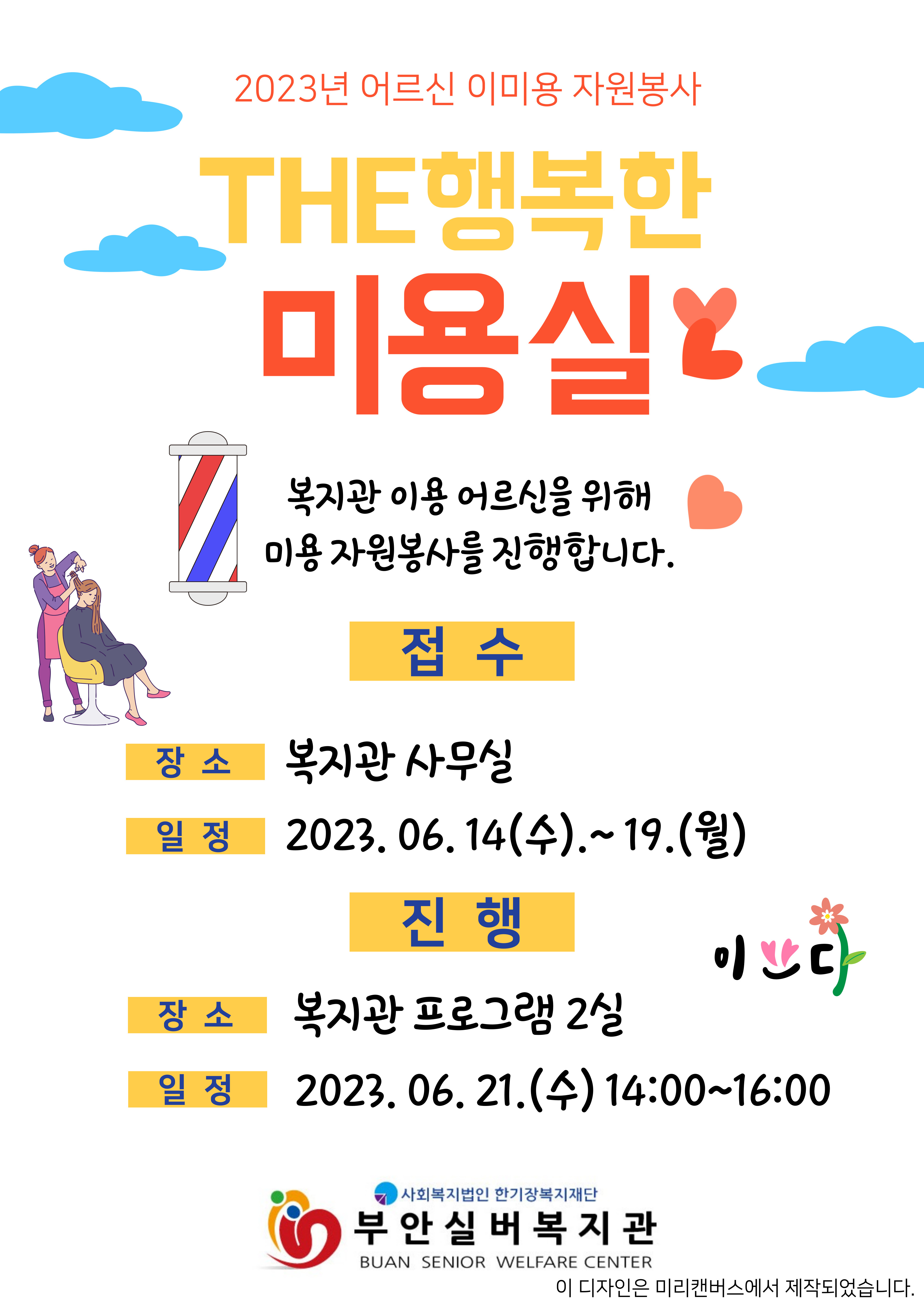부안실버복지관에서는 복지관 이용 어르신의 건강한 노후생활을 위해 '정화미용아카데미학원'과 연계하여 이미용 서비스를 매월 세 번째 수요일에 진행합니다!