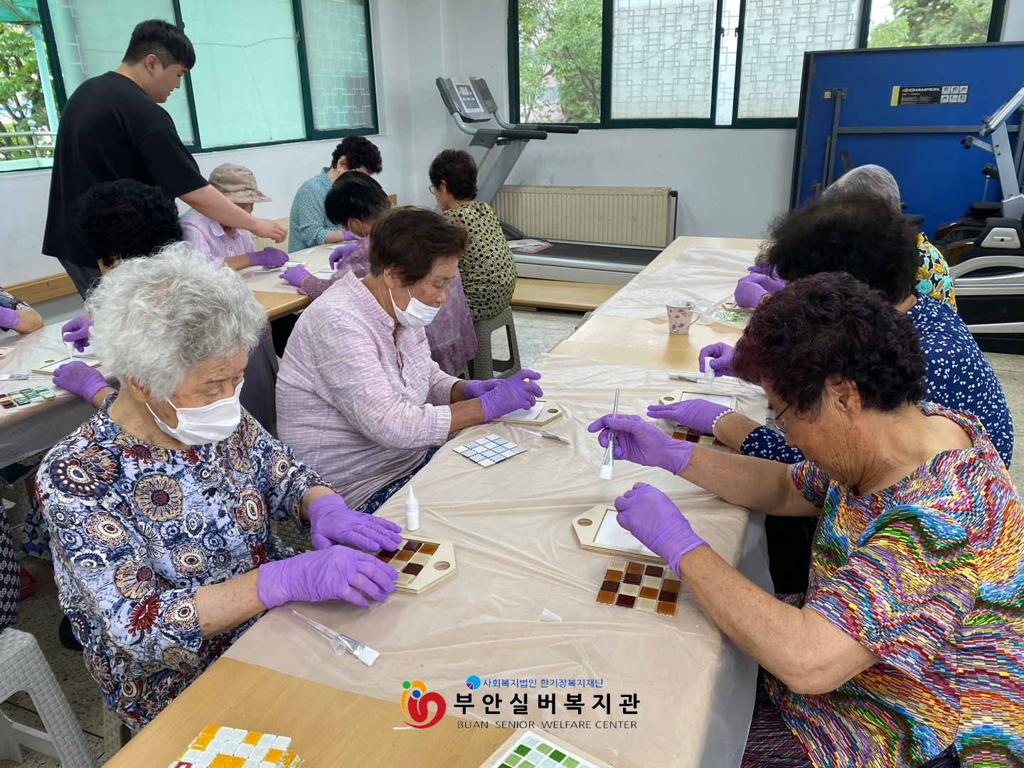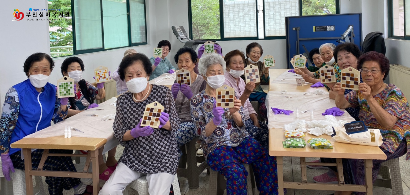 어르신들과 타일을 이용하여 냄비 받침을 만들었습니다. 어르신들이 타일을 이용해 무언가를 만들어 보는 것은 처음이라며 즐겁게 참여하셨습니다. 새로운 얼굴이 보이면 몇 동 몇 호에 사는지, 이름은 무엇인지 물어보며 자연스럽게 말을 걸어 주십니다. 김 OO어르신은 4OO호에 사는 친구도 같이 오면 좋았을 텐데 아파서 오지 못했다며 친구에게 선물해 주고 싶다고 하셨습니다.