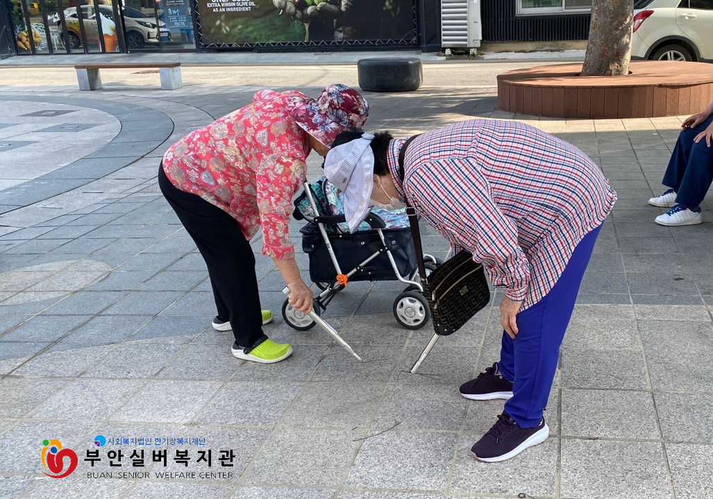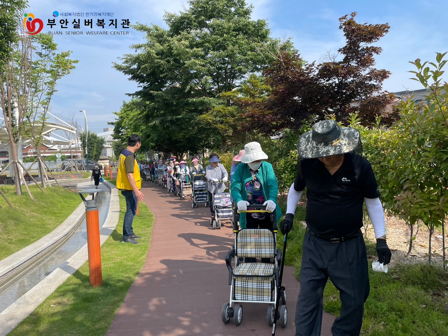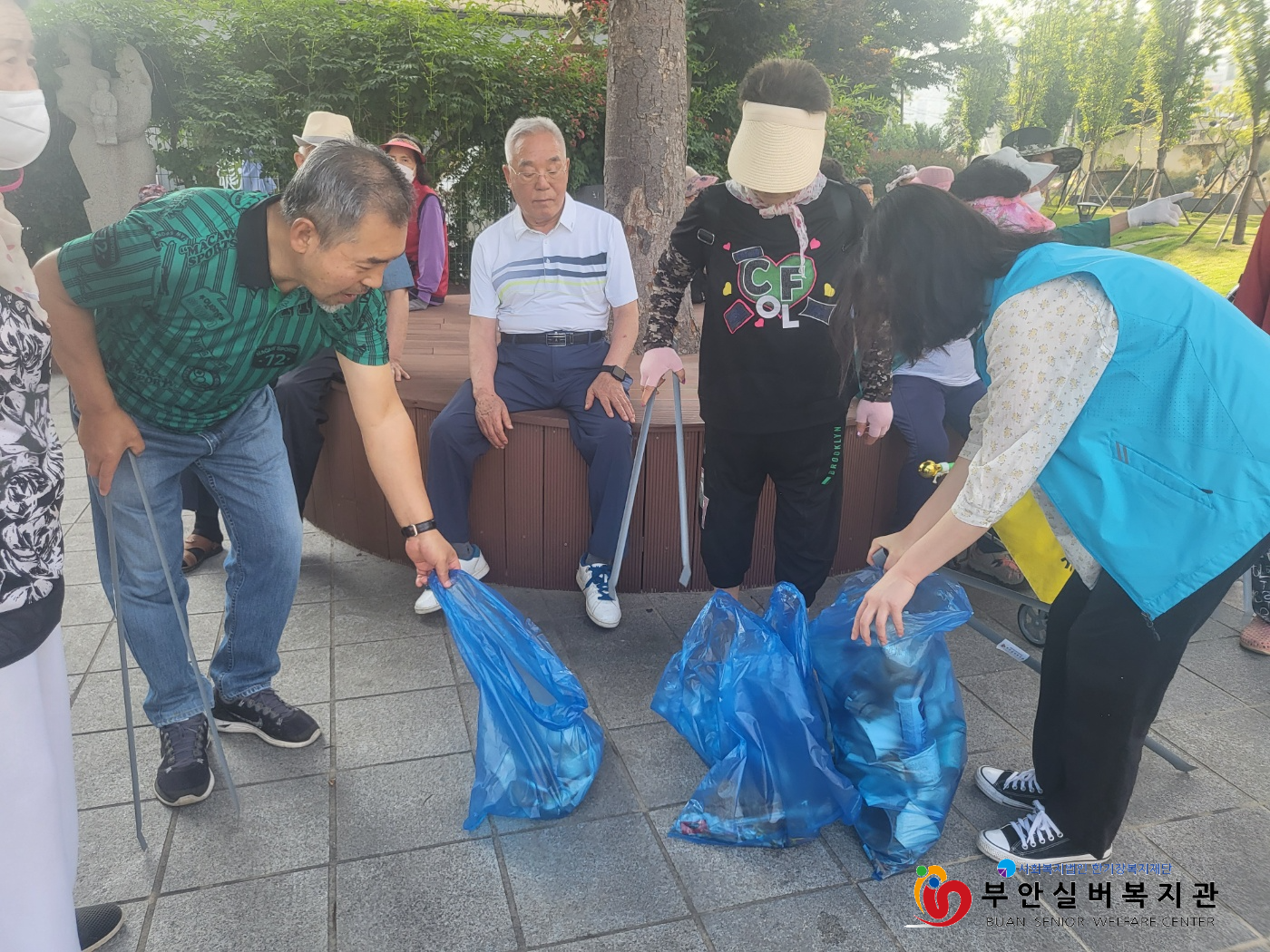 부안실버복지관 ESG* 경영 실천에 동참하고자 '선배시민 마을지킴이 봉사단(이하 선배시민봉사단)'이 쓰담 걷기(플로깅) 2차 활동을 지난 6월 20일 진행했습니다. 주공2차 사거리에서 시작하여 물의거리 분수광장까지 구석구석 보이지 않는 쓰레기를 주웠습니다. 거동이 불편하여 실버카를 이용하시는 어르신들이 많았지만, 우리 지역의 일이라 솔선수범하는 마음으로 많은 인원이 참석해주셨습니다.