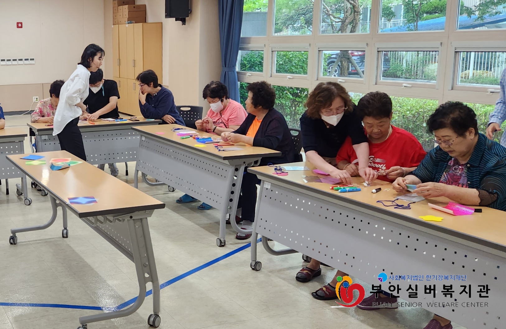 첫 시작은 언제나 긴장 반, 기대 반으로 시작하는 것 같습니다. 첫 회기 송원, 홍윤서 강사님은 어색함과 서먹함을 풀기위해 다양한 도구를 가지고 오셔서 어르신들과 상호신뢰관계(라포형성) 형성을 위해 노력하셨습니다. 각자 자신의 이름과 좋아하는 음식, 하고 싶은 말을 들으며 즐거운 시간을 보냈습니다. 자기소개 이후에 내가 좋아하는 색종이에 이름을 쓰고 명찰을 직접 만들기도 하고 옆 짝꿍과 왜 이 색깔이 좋은지 서로 이야기하며, 짝꿍의 이야기를 내가 직접 소개하는 것으로 어르신들은 더욱더 친밀감을 형성할 수 있었습니다.