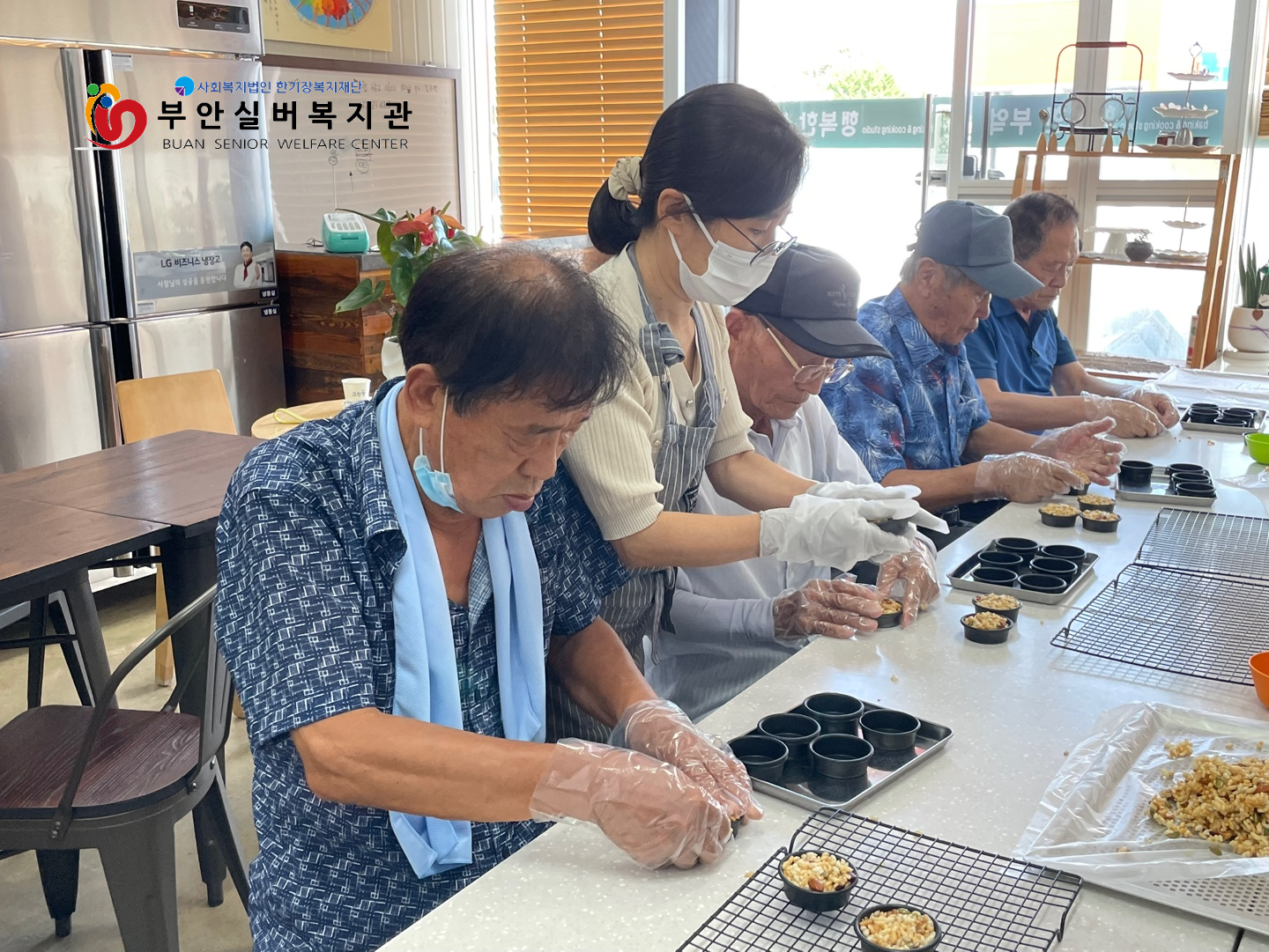 2023년 전북사회복지공동모금회 지원사업 남성홀몸어르신 자조모임 '용감한 형제들'이 지난 8월 21일 부안읍에 있는 '행복한 부엌'에서 두 번째 쿠킹클래스를 진행하였습니다. 처음 쿠킹클래스를 제안했을 때 '빵은 별로다' '뭐 그런 걸 한다 하냐' 하시던 분들이 그때의 경험이 좋았는지 두 번째 쿠킹클래스는 "너무 좋다!", "재미있다!" 하셨습니다.