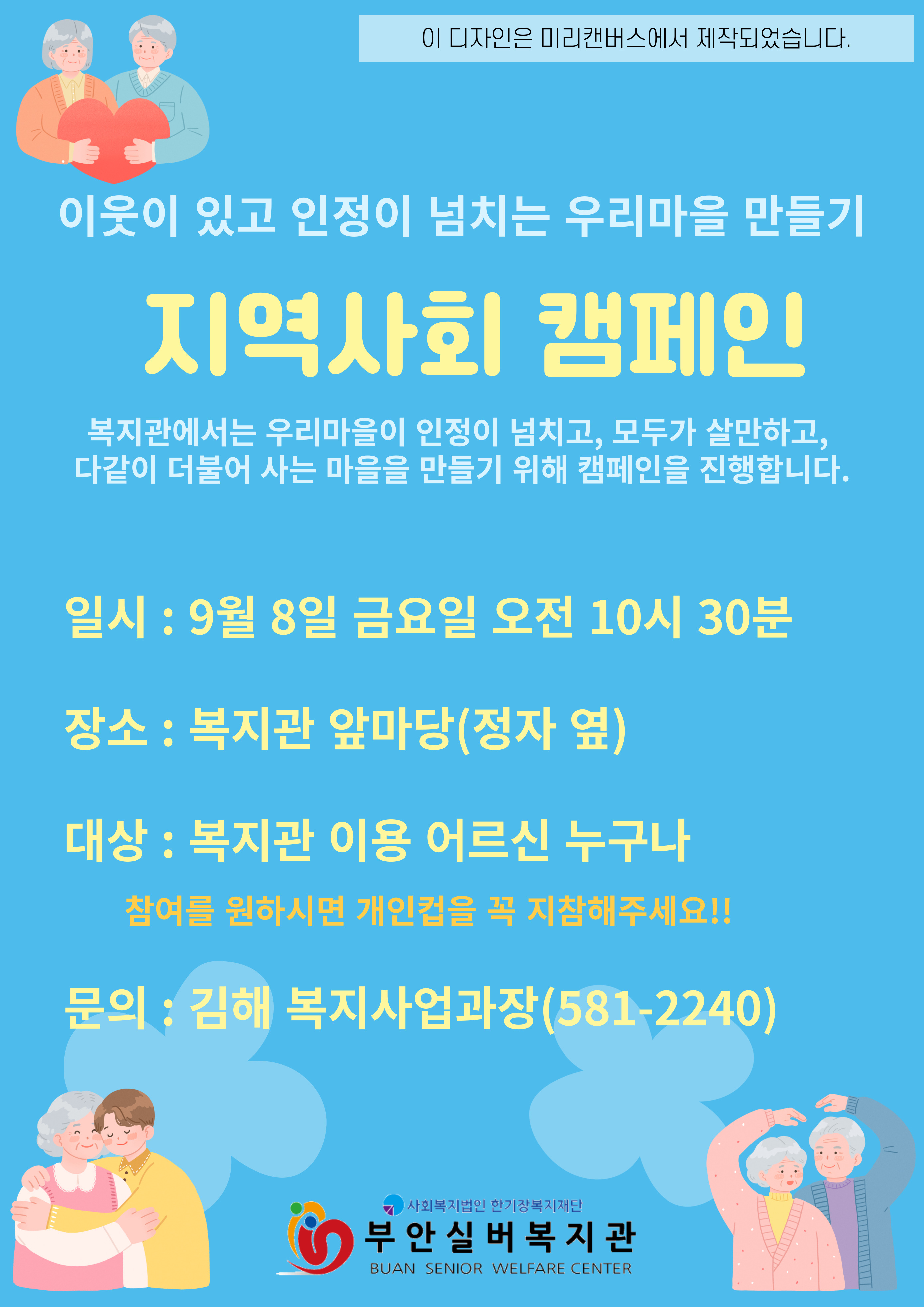 부안실버복지관에서는 "인정이 넘치고, 모두가 살만하고, 다 같이 더불어 사는 마을"을 만들기 위해 9월에도 지역사회 캠페인을 진행합니다. 이번 시간에는 "감사인사"라는 주제로 지역사회 캠페인을 진행합니다. 참여를 원하시는 어르신들은 개인 컵 및 텀블러를 지참해 주시면 감사하겠습니다. 일회용 및 종이컵은 안 돼요.