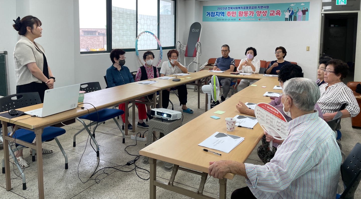 거점지역(주공1차아파트) 주민 활동가 양성 교육은 이웃 살핌 활동을 하는 활동가들을 대상으로 하여 군산 나운동 및 전주 평화동의 마을 공동체 사례 이야기를 중심으로 진행되었습니다. 교육을 진행해주신 평화사회복지관 김명주 과장님, 학산종합사회복지관 노미나 팀장님, 군산나운종합사회복지관 박현희 대리님께 진심으로 감사드립니다.