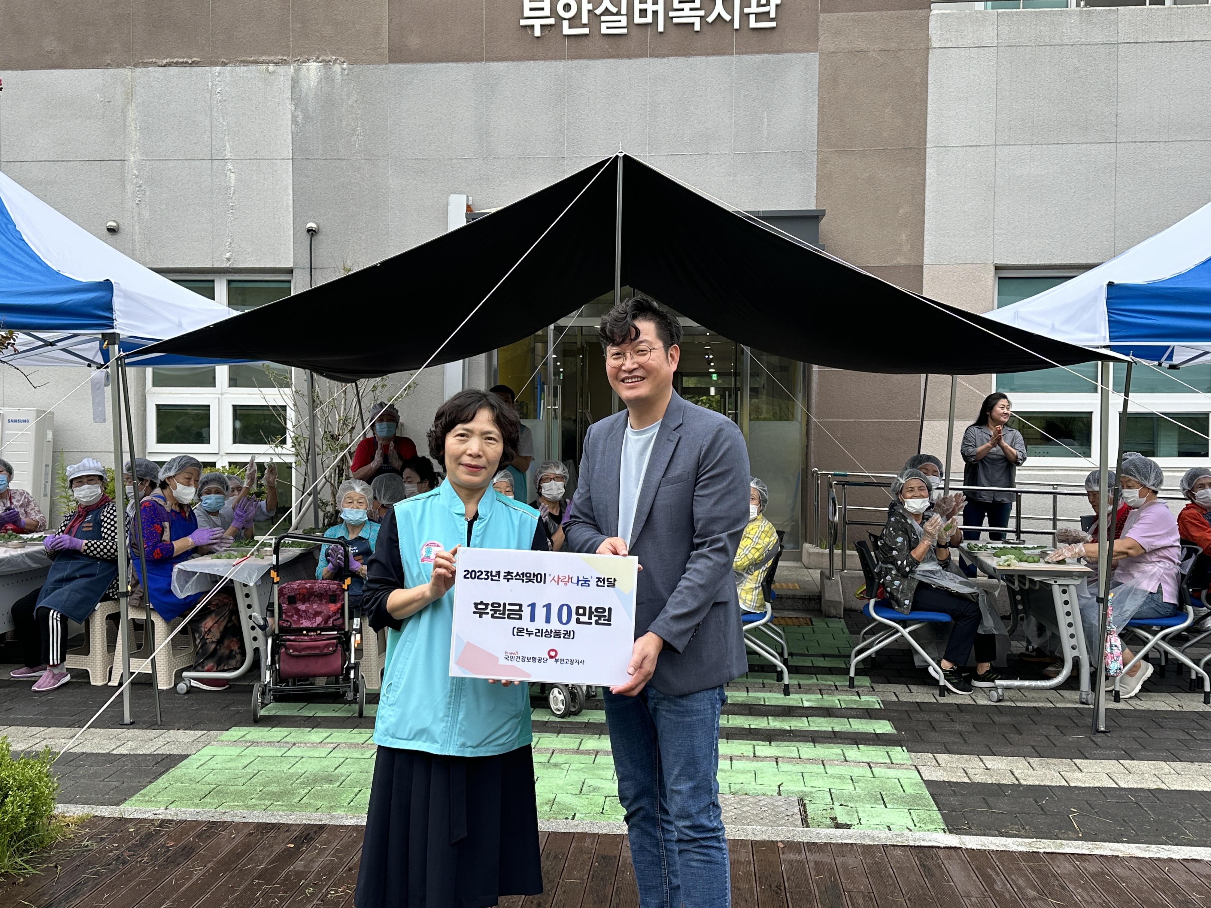 '국민건강 보험공단 부안고창지사'  김미영 지사장님과 직원분들이 추석명절을 맞이하여 온누리 상품권 110만원을 후원해 주셨습니다. 매월 직원분들이 모아주시는 후원금으로 2020년 부안실버복지관 개관과 함께 지금 까지 명절마다 잊지 않으시고 함께해주셔서 감사합니다. 올해는 지사장님과 함께 송편도 만들고, 급식소 배식 봉사 까지 참여해주셔서 어르신들께서 더욱 즐거운 시간을 함께 할 수있었습니다.